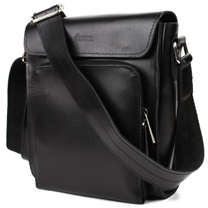 Сумка на плече TARWA 30272 застібається на блискавку та зверху накривається клапаном з магнітною кнопкою. На лицьовій стороні є гравіювання з логотипом виробника. Під клапаном розташовується практична, відкидна, містка кишеня на блискавці з внутрішніми шкіряними відсіками, для пластикових карток. На задній стороні виробу знаходиться ще одна кишеня на блискавці.