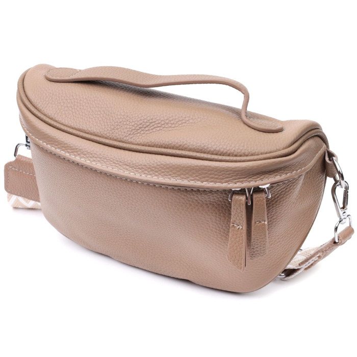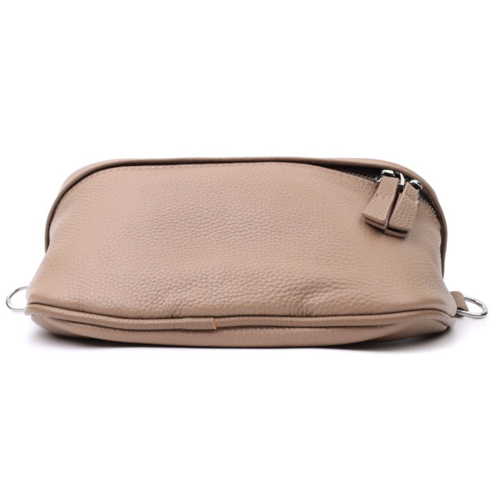 Актуальна цього сезону сумка через плече з натуральної шкіри. Аксесуар складається з основного відділення, що закривається на блискавку, кишені на блискавці та кишені відкритого типу усередині. Носити сумку можна на плечі, через плече, а також в руках для цього є текстильний ремінь, що знімається, і шкіряна ручка.