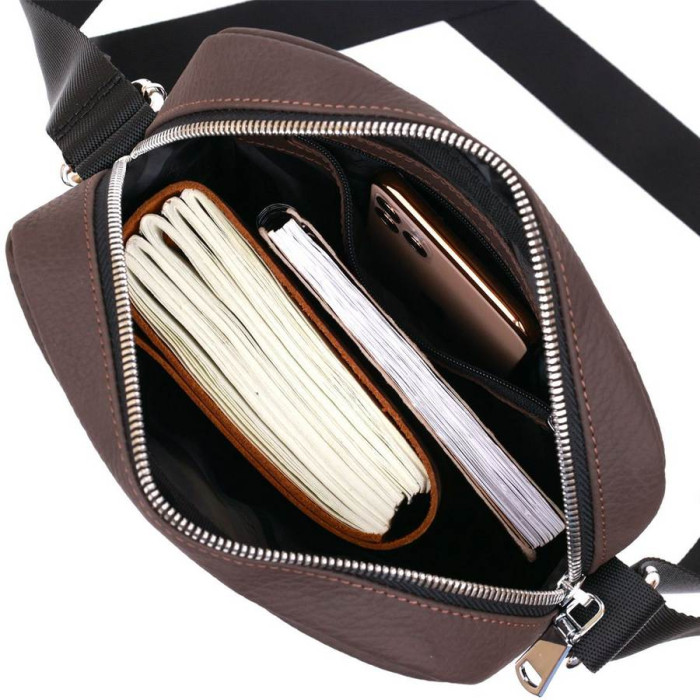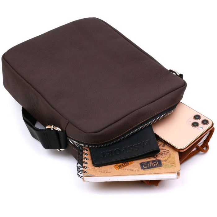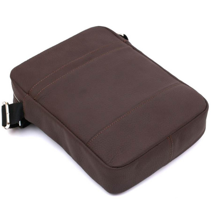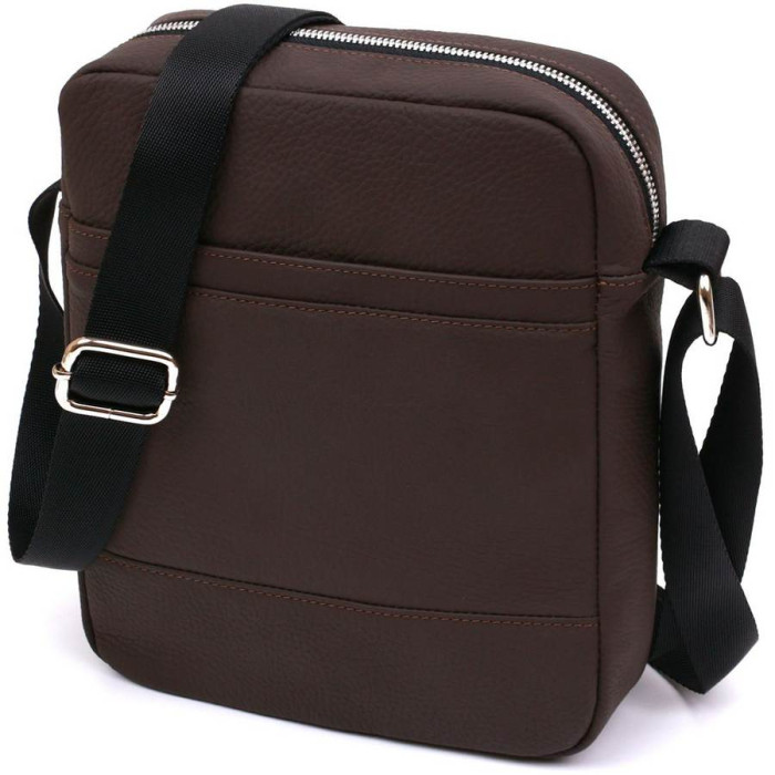 Практична та стильна чоловіча сумка через плече від українського виробника. Виконано цю модель з натуральної високоміцної шкіри з відмінними експлуатаційними характеристиками. Усередині є одне містке відділення і потайна кишеня на блискавці, на зовнішній стороні є кишеня на магніті. Ремінь зроблений із міцного текстилю та регулюється по довжині.
