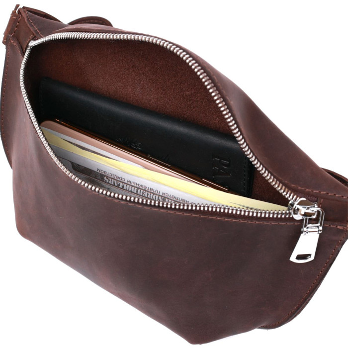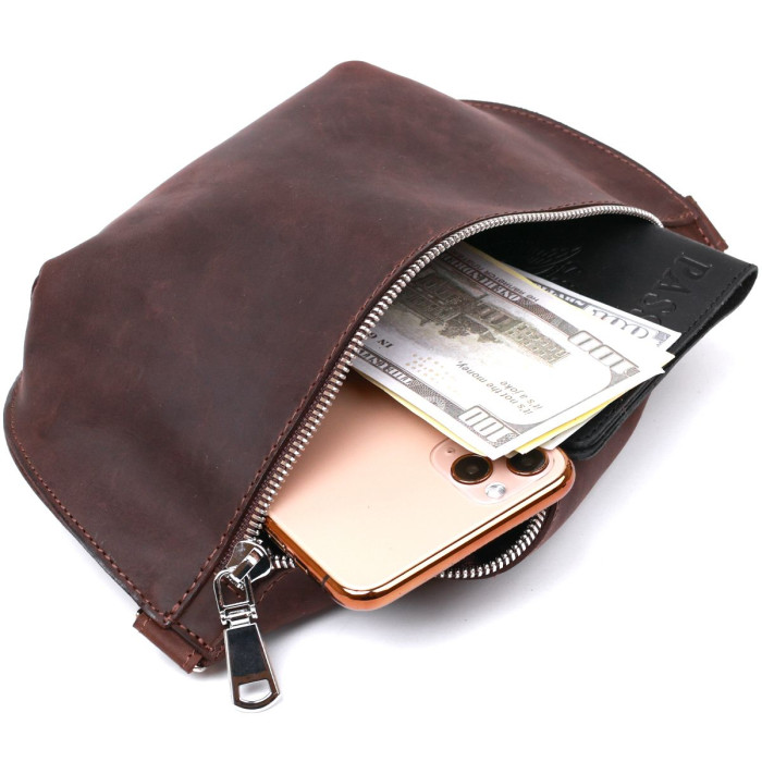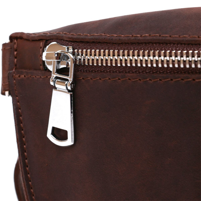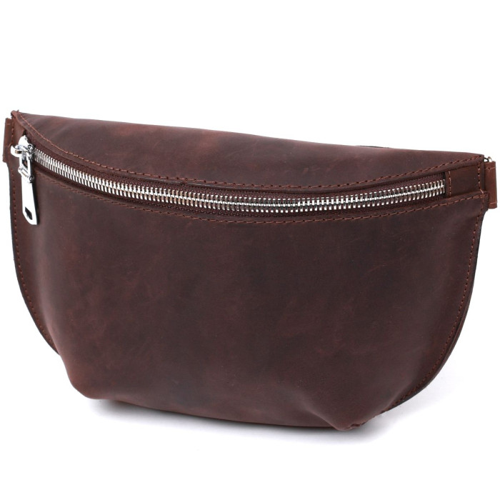 Чудова жіноча бананка у міському сучасному стилі. Вона має невеликий розмір, але дуже містка та зручна в експлуатації. Матеріал виготовлення – натуральна шкіра з покращеними показниками стійкості до зношування. Дана модель має вінтажну гладку фактуру та темно-коричневий колір. Поспішайте купити цей виріб собі або на подарунок близькій людині.