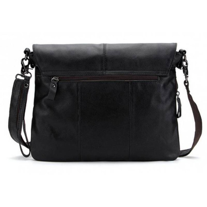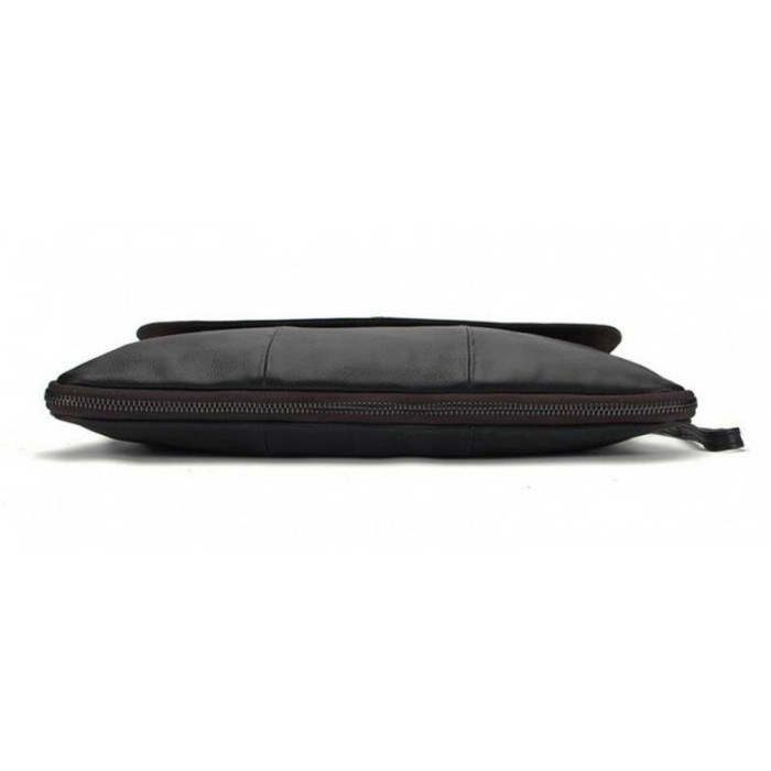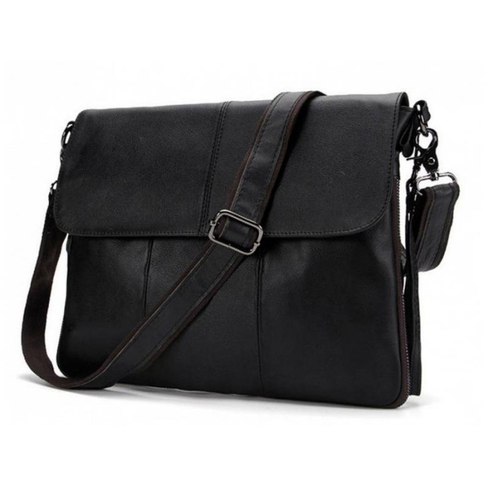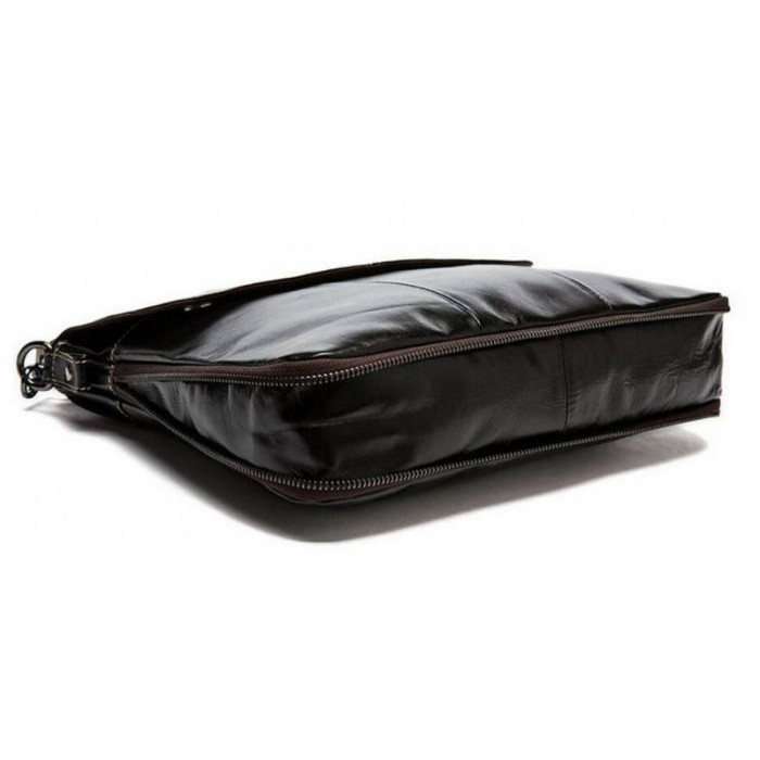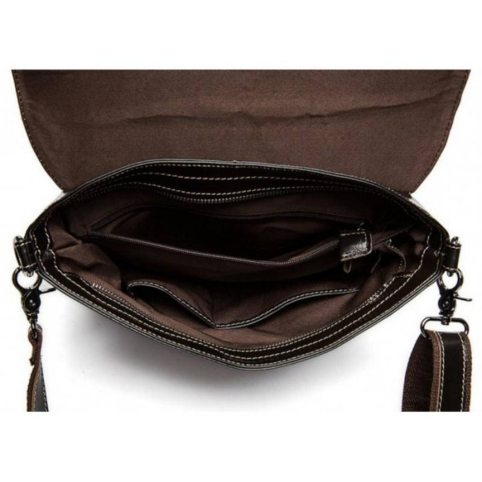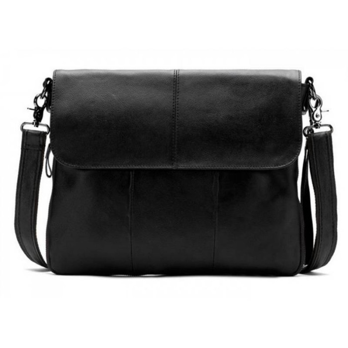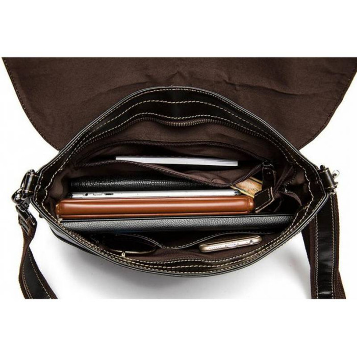 Елегантний месенджер буде незамінним помічником в повсякденних чоловічих справах і поїздках. Відмінною особливістю даної моделі є можливість розширення корисного простору за допомогою застібки на дні сумки. Мессенджер виконаний в класичному стилі з натуральної шкіри з зернистою фактурою. Насичений чорний колір гармонійно розбавлений застібками і підкладкою благородного коричневого кольору. Кілька просторих відділень і регульований знімний ремінь додають виробу практичності і комфорту в експлуатації.