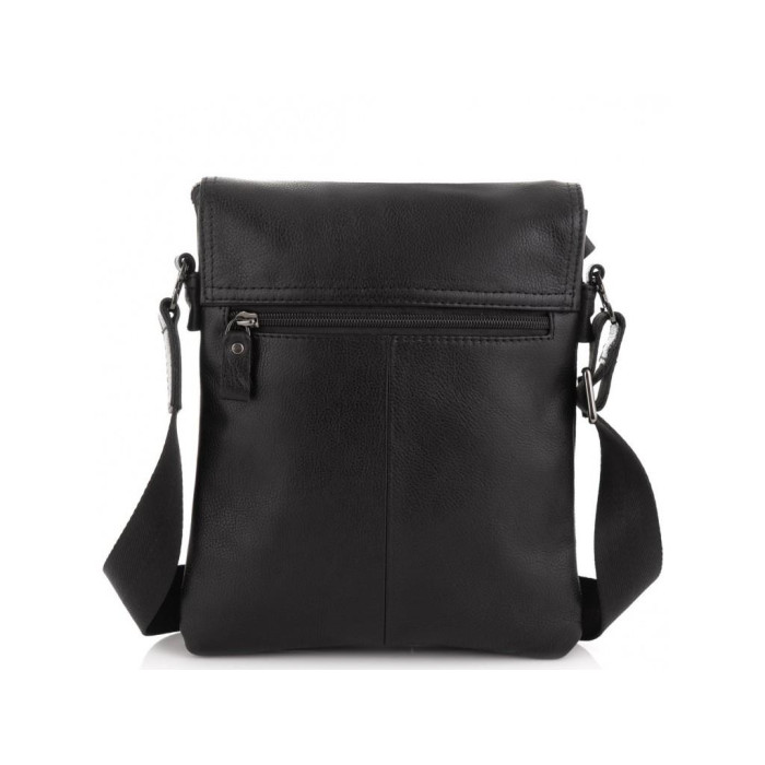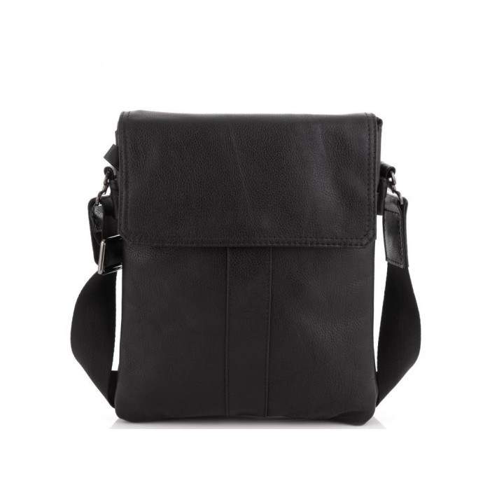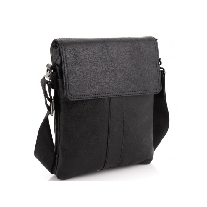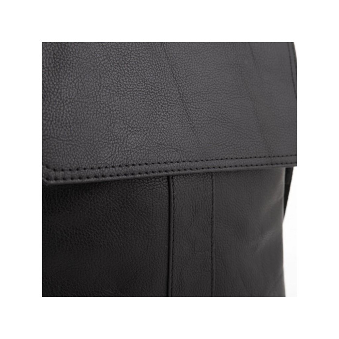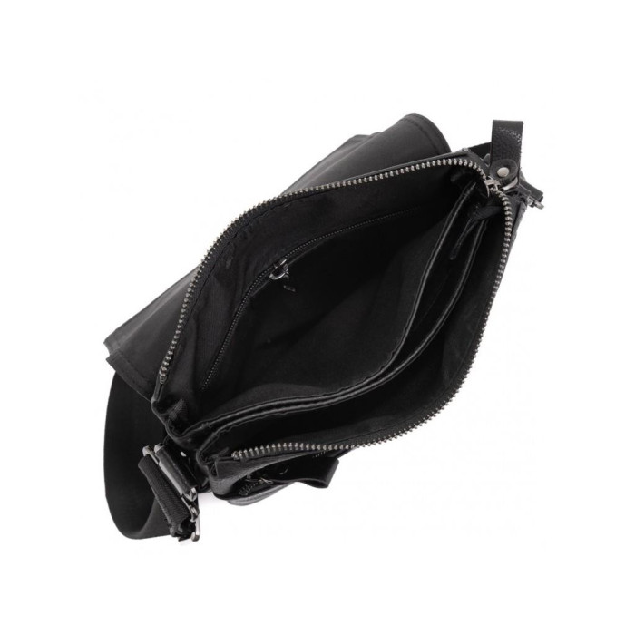 Чорна шкіряна сумка в зернистій шкірі. Мессенджер зручно носити на плечі, за рахунок текстильного плечового ременя, який регулюється по довжині. Усередині сумки чорна щільна підкладка. Одне основне відділення знаходиться під клапаном на магнітній кнопці. З лицьового боку також є кишеня на блискавці, з тильного боку кишеня на блискавці. Усередині сумка розділена на два відділення, кишенею-перегородкою, ще є кишеня на блискавці і кишеня відкритого типу для дрібниць.