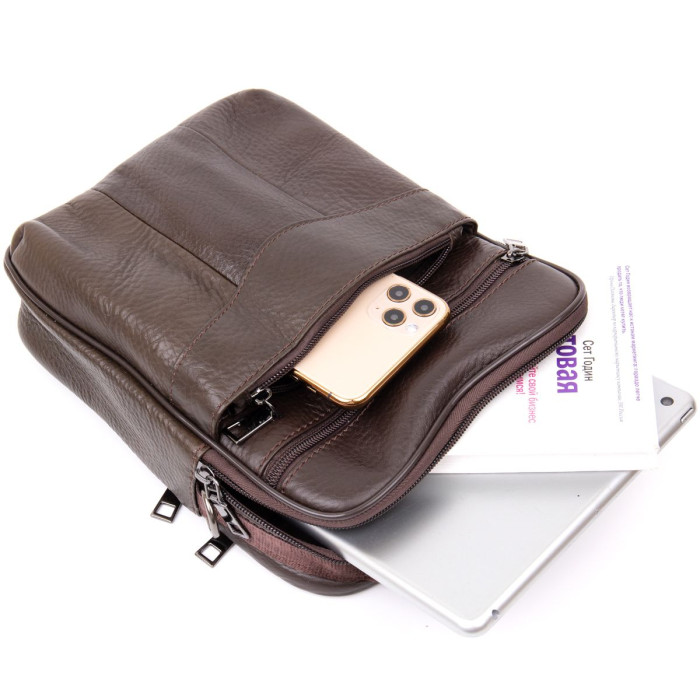 Месенджер для чоловіків з натуральної шкіри невеликого розміру. Аксесуар ви можете носити як в руках, так і на плечі. Дизайн аксесуара витриманий в класичному стилі з урахуванням всіх сучасних тенденцій. Усередині сумки якісна текстильна підкладка. Доповнено месенджер якісною фурнітурою. Сумка ідеально підійде для роботи або навчання, а також для ділових зустрічей або зустрічей з друзями. Месенджер - ідеальний варіант сумки для сучасного чоловіка. Виріб має весь необхідний функціонал. Шкіряний месенджер - кращий подарунок з будь-якого приводу і без.