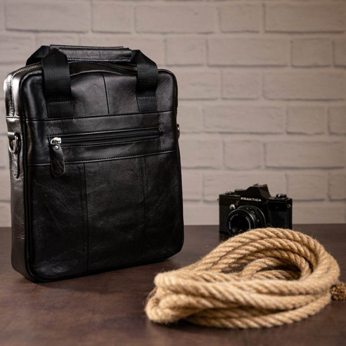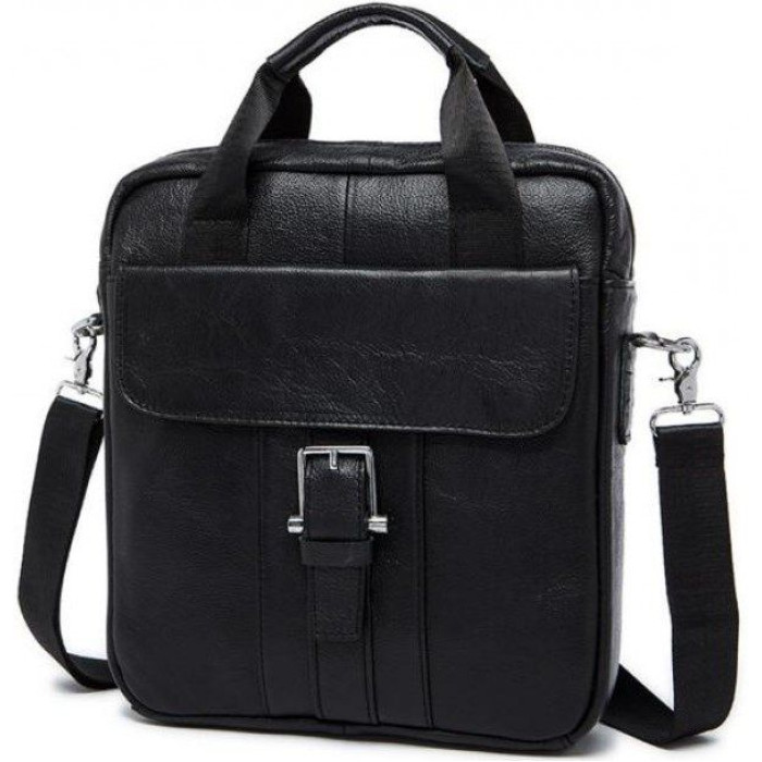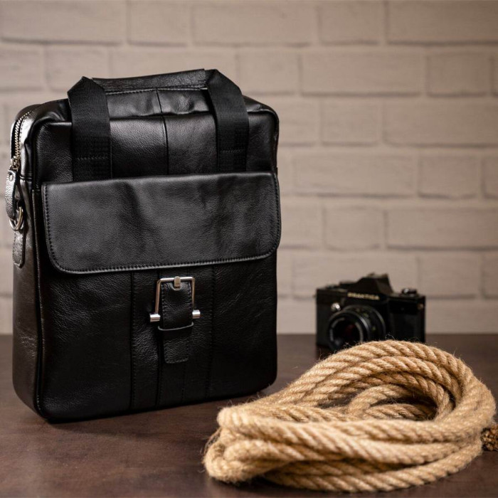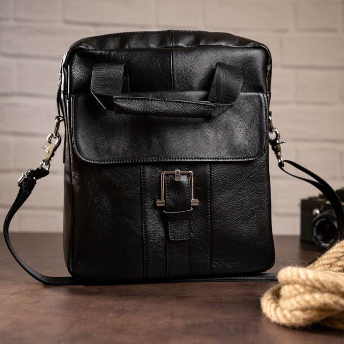 Сучасна чоловіча сумка через плече. Аксесуар виконаний з натуральної високоякісної зернистої шкіри. Колір фурнітури: срібло. Сумка надійно прошита міцною ниткою. Шви - рівні, акуратні.