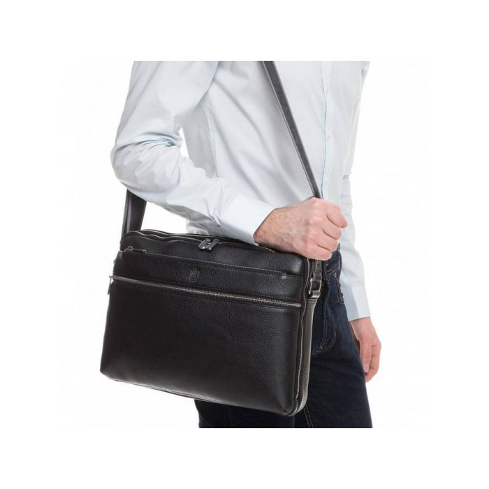 Месенджер горизонтального формату з телячої шкіри. Оптимальний розмір в поєднанні з класичним дизайном роблять цю модель вірним помічником на кожен день.Сумка має два основних відсіка. Один з них розмыщує в собі бічну кишеню на блискавці, другий, менший за розміром, ідеально підійде для гаджетів або документів. З лицьового боку дві горизонтальних кишені, з тильного боку одна кишеню на блискавці. Наплічна шлейка регулюється по довжині. Надійна фурнітура сріблястого кольору.