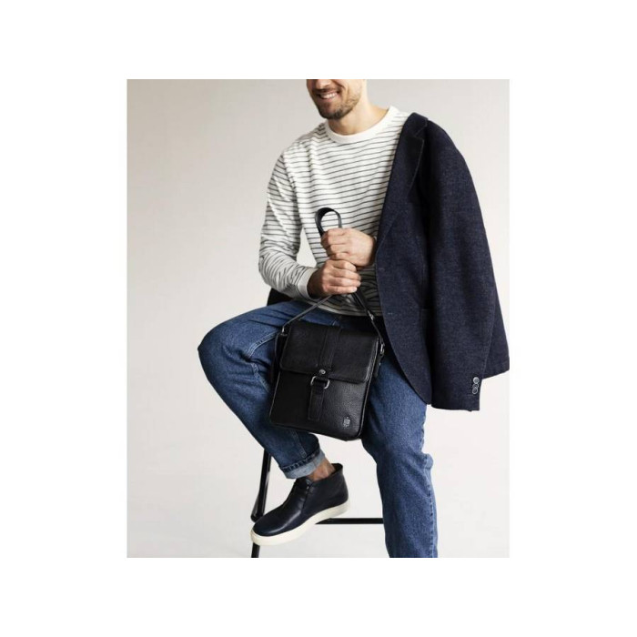 Месенджер з телячої шкіри з зернистим тисненням поверхні. Одне основне відділення закривається на блискавку і приховано під накидним клапаном з декоративною пряжкою на магніті. Усередині щільна підкладкова тканина і кишенька на блискавці. З лицьового боку накладна кишеня відкритого типу. З тильного боку кишеня на змійці. Наплічна шлейка регулюється по висоті. Модель каркасна, відмінно тримає форму. Сумка ідеально підійде для планшета, щоденника, портмоне і інших особистих речей.
