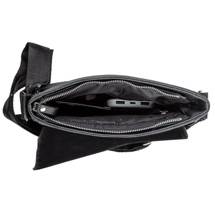 Таку сумочку можна носити на плечі або через плече - вона завжди буде практично невагомою і дуже зручною при пересуваннях. Виріб доповнює красива металева фурнітура кольору срібла, яка відмінно поєднується з чорною шкірою.