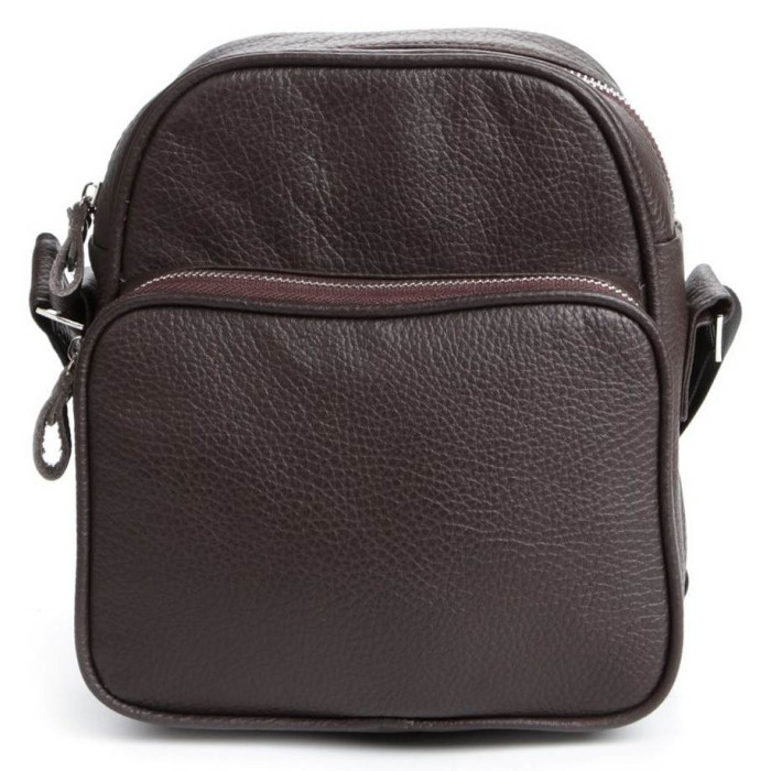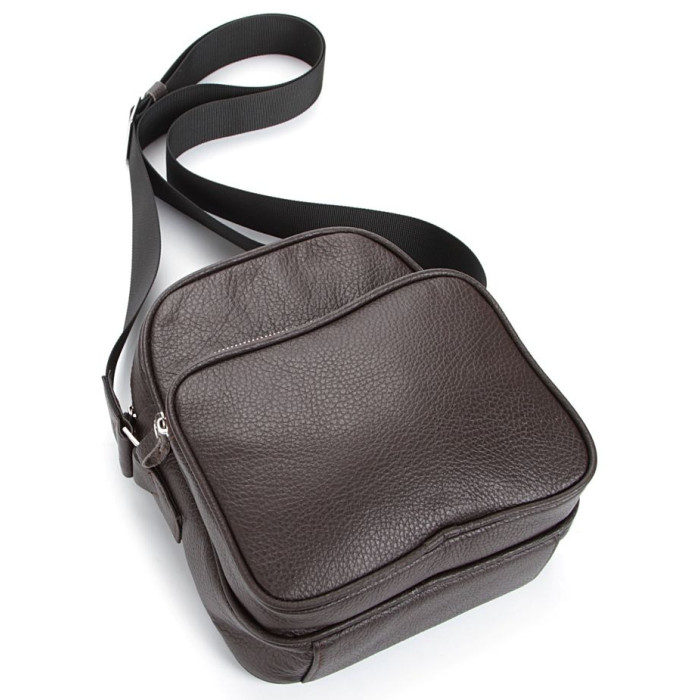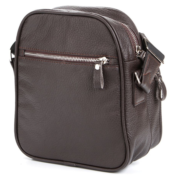 Сучасна чоловіча шкіряна сумка темно-коричневого кольору. Аксесуар виконаний зі шкіри флотар, яка відрізняється "зернистою" фактурою. Колір фурнітури: срібло. Сумка носиться через плече за допомогою регульованого плечового ременя, який виконаний з міцного текстильного матеріалу.