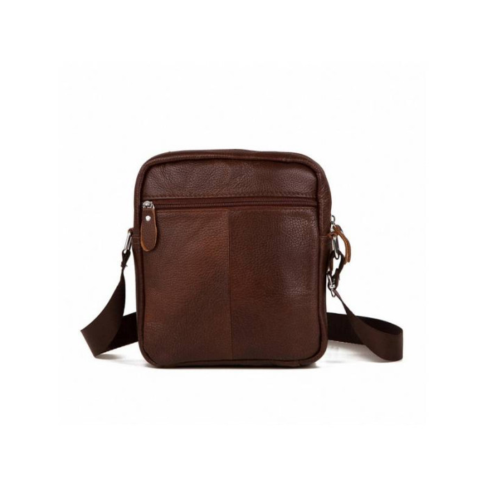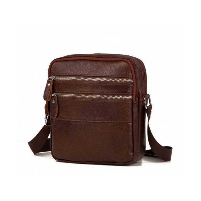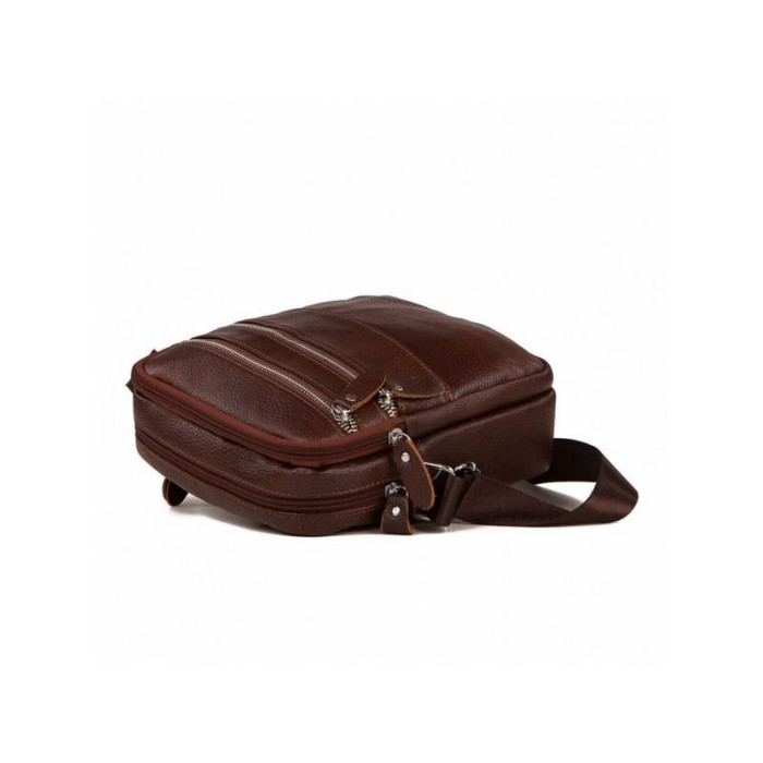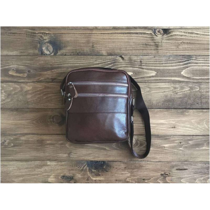 Чоловіча шкіряна сумка коричневого кольору. Поверхня телячої шкіри має зернисту структуру. У невеликий месенджер, завдяки продуманому дизайну, можна вмістити більшість речей повсякденного користування і розвантажити кишені одягу. Для зберігання ключів, телефону,