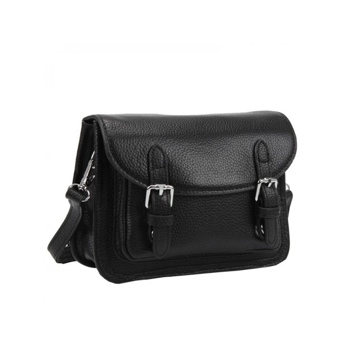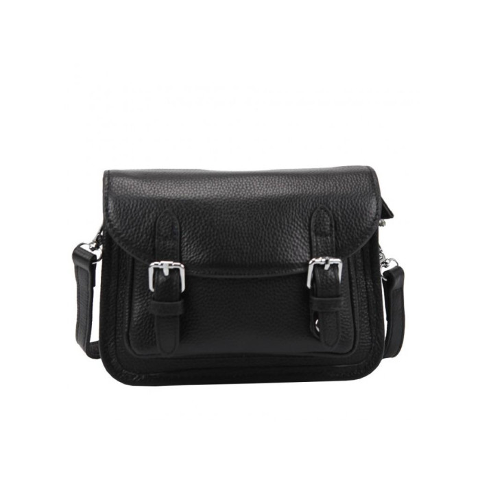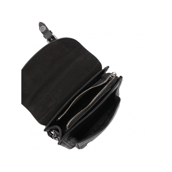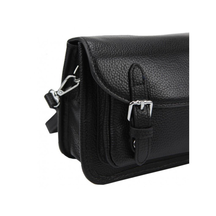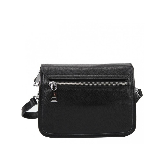 Чорна жіноча сумка з накладною кишенею і клапаном. Усередині сумки є кишеня відкритого типу і кишеню на блискавки. На тильній стороні також є кишеня з блискавкою.