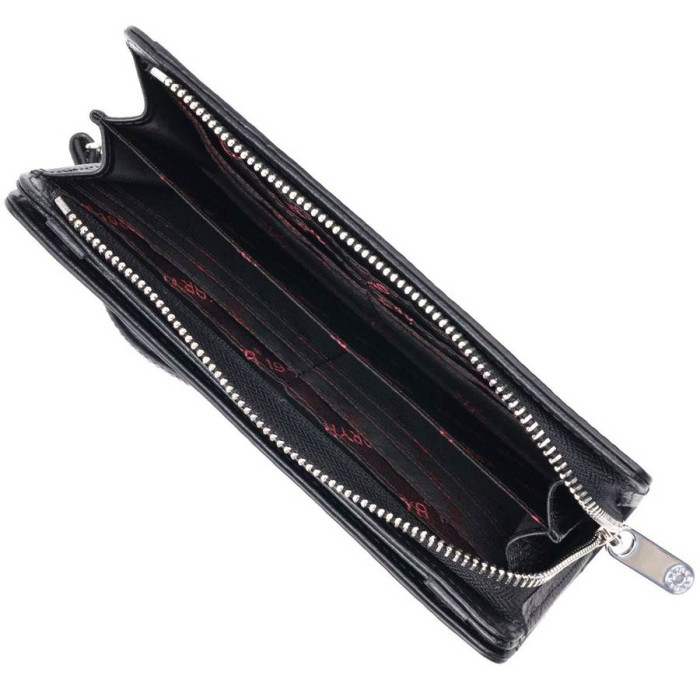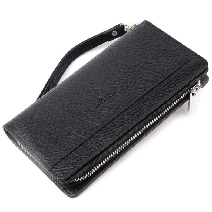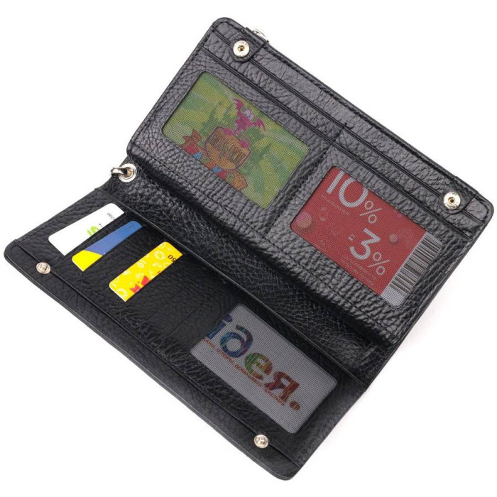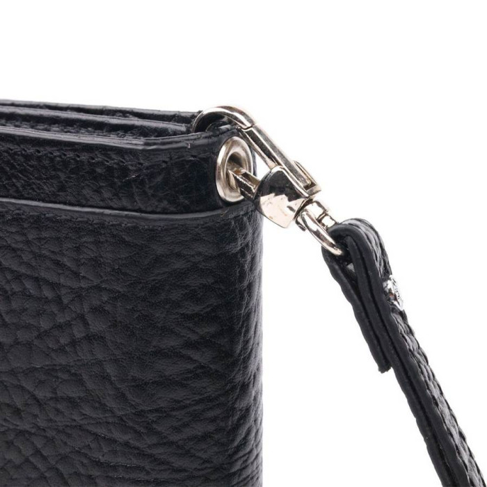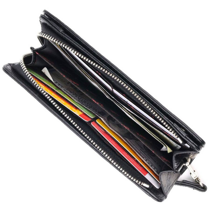 Красивий клатч із натуральної шкіри, в класичному чорному кольорі, з використанням добротного текстилю (внутрішня підкладка). Особливістю гаманця є наявність блоку для кредитних карток, що закривається на кнопки. Основне відділення аксесуара закривається на блискавку. Носиться за допомогою ремінця на зап'ясті або просто в руці. Використовується якісна фурнітура кольору срібла. Запакований аксесуар у фірмову коробку та пакет бренду. Вироби з натуральної шкіри завжди будуть чудовим подарунком для близької людини.