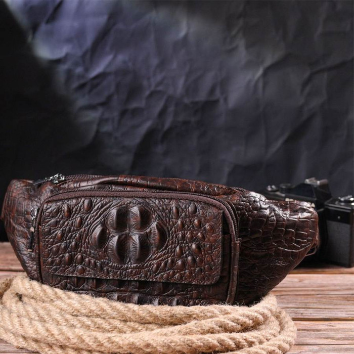 Стильна сумка для чоловіків з натуральної фактурної шкіри високої якості, з тисненням під крокодила. Бананка – одна із найпопулярніших моделей серед наших клієнтів. Така сумка стане дуже практичною та незамінною для будь-якого чоловіка. Сумка має одне основне відділення, три кишені зовні. Металева фурнітура представлена у сріблястому кольорі. Виріб стане чудовим подарунком для близької людини.