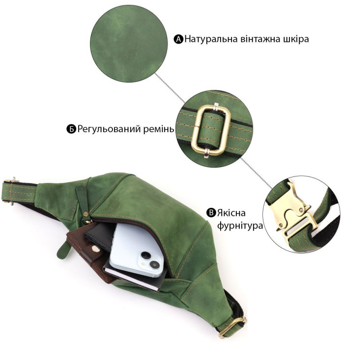 Сумка-бананка з натуральної шкіри Shvigel у зеленому кольорі - поєднання практичності, стилю та індивідуальності. Ця чоловіча сумка-бананка від українського бренду Shvigel ідеальний вибір для тих, хто цінує зручність, але хоче виглядати оригінально. Виконана з міцної натуральної вінтажної шкіри модель представлена в зеленому кольорі, який вигідно виділяється на тлі класичних чорних або коричневих аксесуарів. Такий відтінок надає сумці благородного та свіжого вигляду, підкреслюючи вашу індивідуальність.