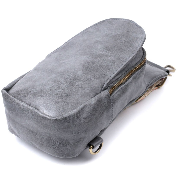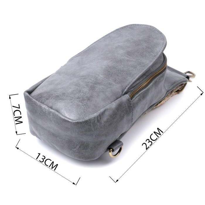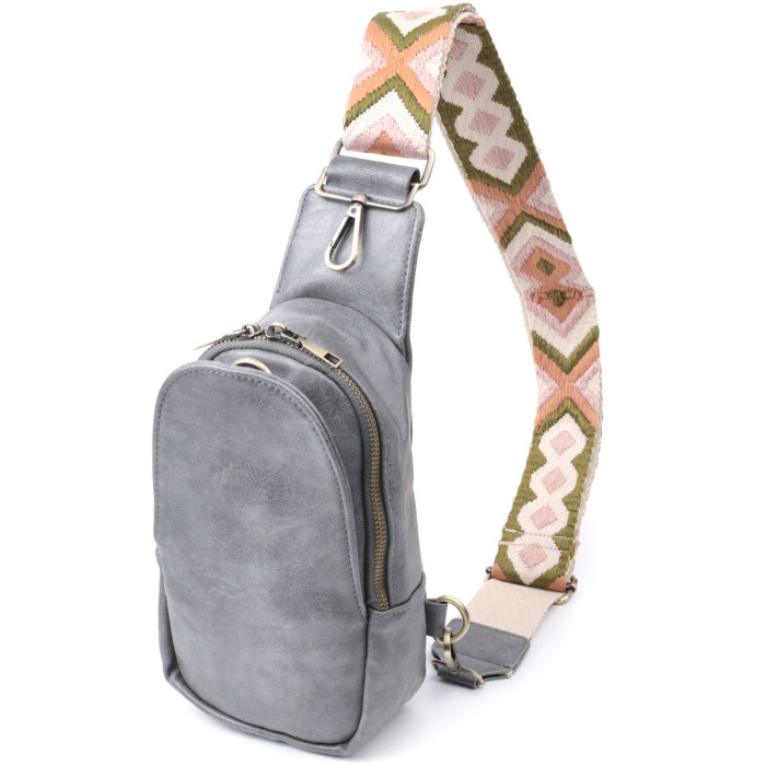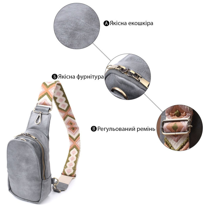 Невелика жіноча сумка через плече на кожен день з якісної екошкіри, яка є альтернативою натуральній шкірі. Дана модель складається з одного основного відділення, яке закривається на блискавку і в якому знаходяться три кишені для кредитних карток усередині, а також однієї потайної кишені на лицьовій стороні, що закривається на карабін. Акцентом даної моделі є зручний регульований плечовий ремінець у етнічному стилі, що дуже модно вже кілька сезонів. Екошкіра - високоякісна альтернатива натуральному матеріалу, яка дуже стійка до тертя, до низьких температур, відмінно носиться на відміну від інших штучних матеріалів, а також має гіпоалергенний склад на відміну від натуральної шкіри. Мода не стоїть на місці, на зміну класичним сумкам приходять нові моделі, які обумовлені сучасним часом, саме такою є слінг сумка - зручна, практична, невелика, але містка і головне якісна.