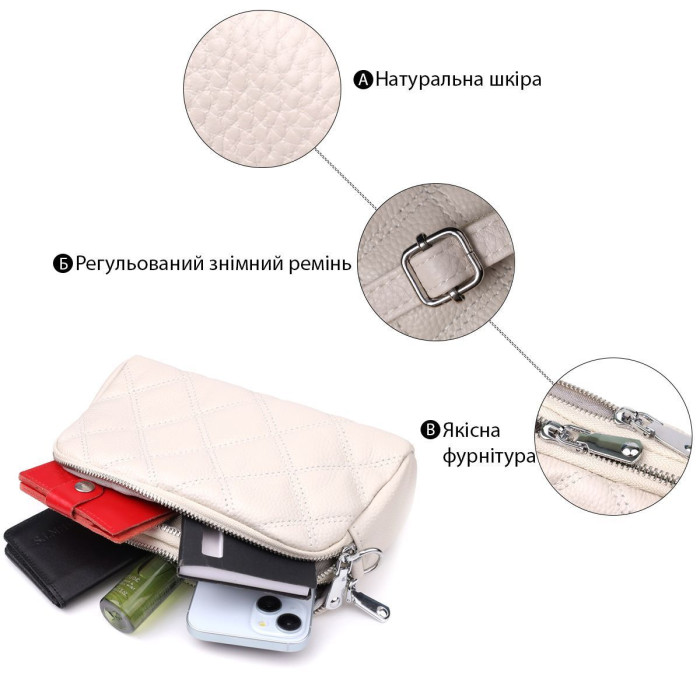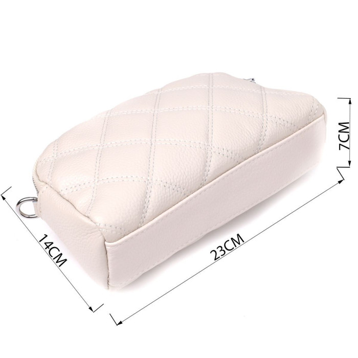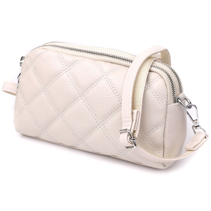 Елегантна сумка з натуральної шкіри у благородному білому кольорі – поєднання вишуканості, стилю та практичності. Модель оснащена двома основними відділеннями, які закриваються на блискавці, забезпечуючи зручну організацію та надійне зберігання ваших речей. Усередині передбачені потайна кишеня на блискавці для цінних предметів та відкрита кишеня для дрібниць, які мають бути під рукою.