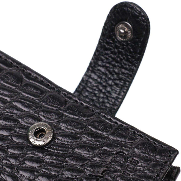 Фактурний гаманець середнього розміру, горизонтального типу, виготовлений з добротної натуральної шкіри, з тисненням під крокодила. У цей аксесуар чудово поміщаються купюри всіх номіналів. Виріб складається з двох відділень для купюр, трьох осередків для кредиток, монетниці та двох відділень під сіткою під документи. Закривається гаманець навпіл шкіряним хлястиком на кнопку. Вироби з натуральної шкіри завжди будуть чудовим подарунком для близької людини.