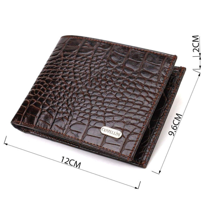 Цікавий чоловічий гаманець із натуральної шкіри з тисненням під крокодила. Аксесуар має одне відділення для купюр усіх номіналів, шість осередків для карток, три кишені під сіточкою для документів та монетницю. Закривається аксесуар навпіл без застібки. На лицьовій стороні, у правому нижньому куті металевий логотип компанії виробника. Купуючи шкіряний аксесуар цієї фірми, собі або на подарунок, будьте певні, що він прослужить Вам не один рік.