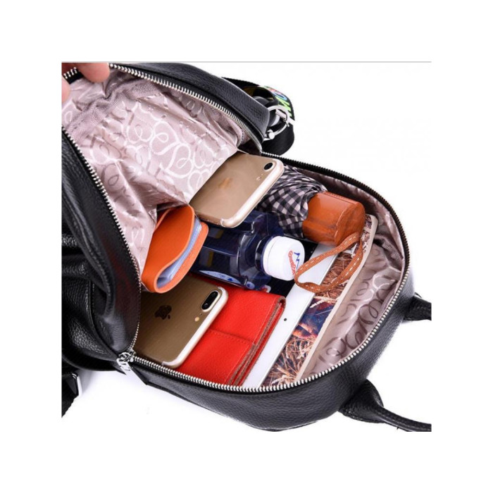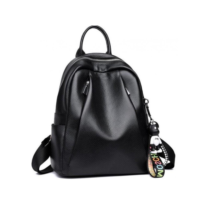Жіночий рюкзак міського типу з брелоком у вигляді ведмедика. Передня сторона з двома кишенями на блискавці, з боків дві відкритих кишені. Всередині є кишеня для мобільного телефону, кишеня-перегородка на блискавці і вшита кишеня на блискавки. Ззаду кишеня на блискавці. Фурнітура металева срібляста.