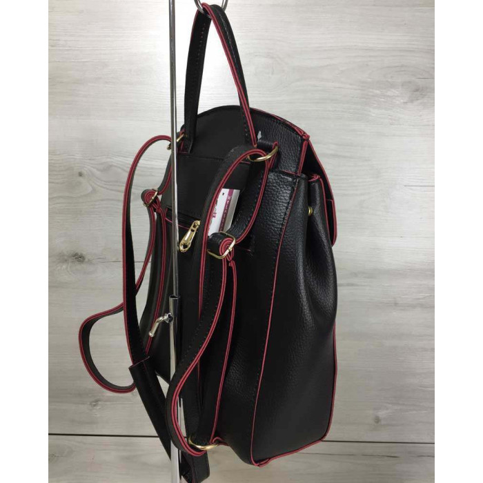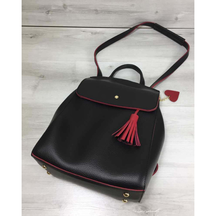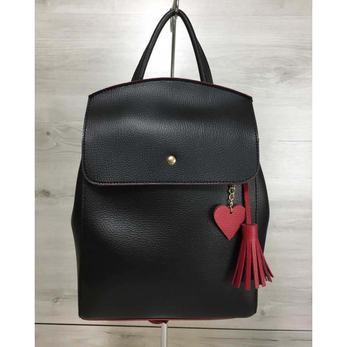 Жіноча молодіжна сумка-рюкзак WeLassie, виготовлений зі штучної шкіри високої якості. Еко-шкіра морозостійка, еластична, щільна. Основне відділення застібається на блискавку, на бічних частинах сумки встановлені кнопки для максимального закривання сумки. Всередині є нашита косметичка, яка ділить сумку-рюкзак на два відділення, а також два кишені для дрібних предметів. Є зовнішня кишеня на застібці. Ремінці регулюються, за рахунок чого модель швидко перетворюється з сумки в рюкзак і навпаки. Під кришкою є магніт. Сумка прикрашена аксесуаром у вигляді сердечка на ланцюжку і пензлика на карабіні, при бажанні карабін легко знімається.