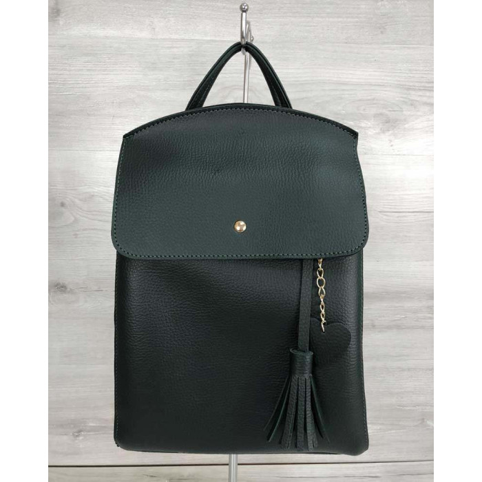 Жіноча молодіжна сумка-рюкзак WeLassie, виготовлений зі штучної шкіри високої якості. Еко-шкіра морозостійка, еластична, щільна. Основне відділення застібається на блискавку, на бічних частинах сумки встановлені кнопки для максимального закривання сумки. Всередині є нашита косметичка, яка ділить сумку-рюкзак на два відділення, а також два кишені для дрібних предметів. Є зовнішня кишеня на застібці. Ремінці регулюються, за рахунок чого модель швидко перетворюється з сумки в рюкзак і навпаки. Під кришкою є магніт. Сумка прикрашена аксесуаром у вигляді сердечка на ланцюжку і пензлика на карабіні, при бажанні карабін легко знімається.