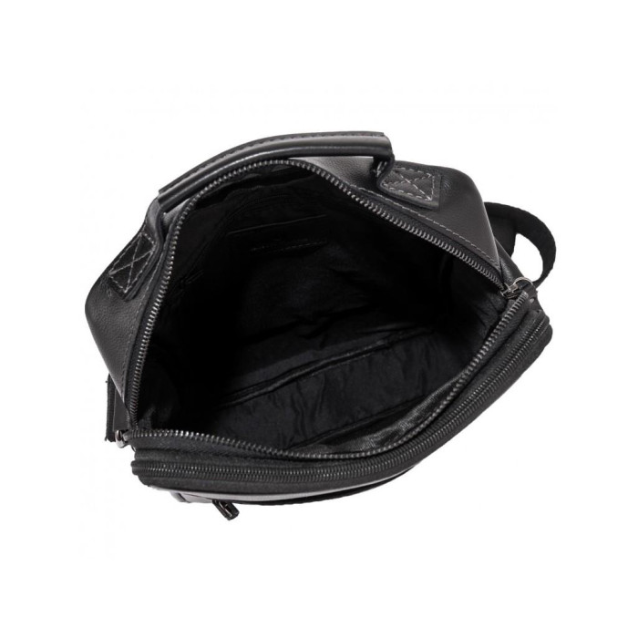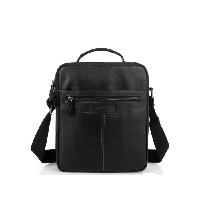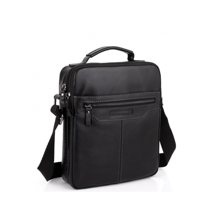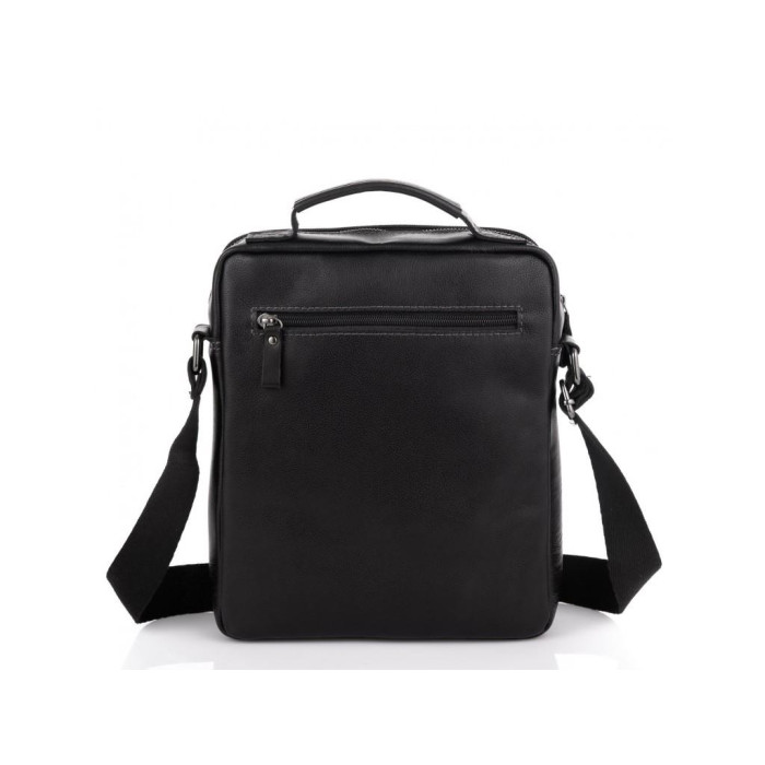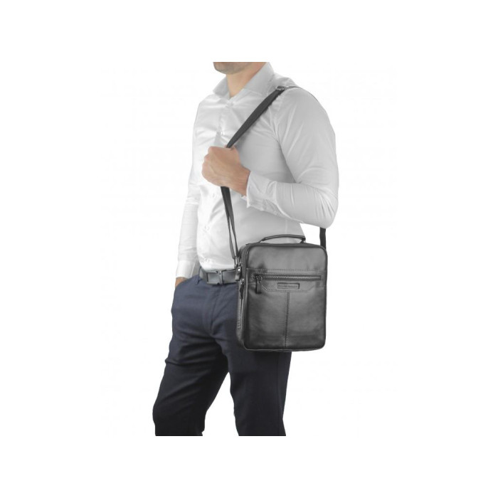 Стильна шкіряна чоловіча сумка через плече чорна. Має дрібно зернисту текстуру. Для носіння можна використовувати плечовий ремінь або шкіряну ручку. Є одне основне відділення на блискавці всередині якого знаходиться кишеня на блискавці для дрібниць. Також є додаткова кишеня трохи менша за основну в ній є дві кишені відкритого типу для дрібниць. З лицьового боку - кишеня відкритого типу і кишеня на блискавці, з тильного боку - кишеня на блискавці горизонтального типу.