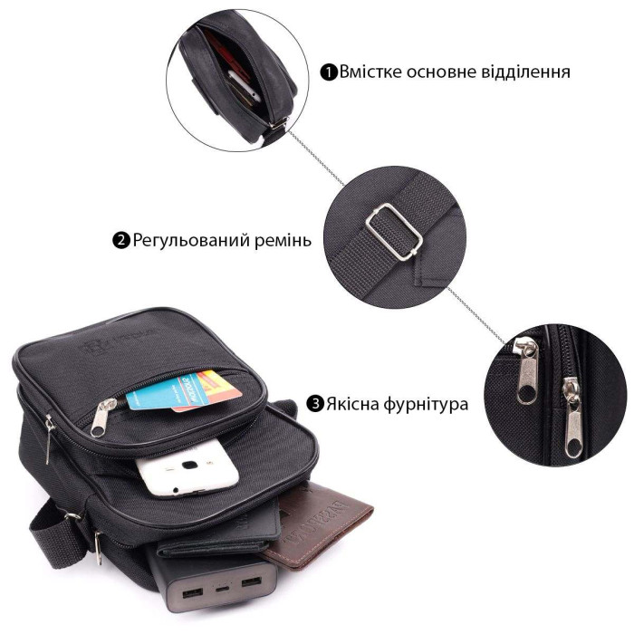 Компактна вертикальна сумка на кожен день з якісного матеріалу – поліестеру. Виріб має невеликий розмір та практичний функціонал, все для Вашої зручності та практичного використання. Аксесуар складається з одного просторого відділення та двох кишень різних розмірів зовні, що дуже зручно. У неї чудово міститься портмоне невеликого розміру, документи, ключі і ще багато необхідних дрібниць, які завжди повинні бути під рукою. Носити аксесуар можна на плечі за допомогою ременя, що надійно не знімається, а також на поясі за допомогою спеціальної петельки. На лицьовій стороні, внизу посередині, вишитий значок бренду, що є запорукою якості. Пошита сумка акуратно, всі рядки рівні, фурнітура надійна і якісна. Стильна сумка стане бажаним подарунком для ваших рідних і близьких і найголовніше дуже корисним і необхідним.