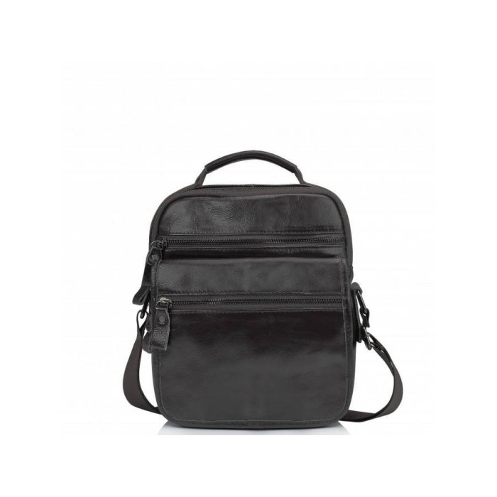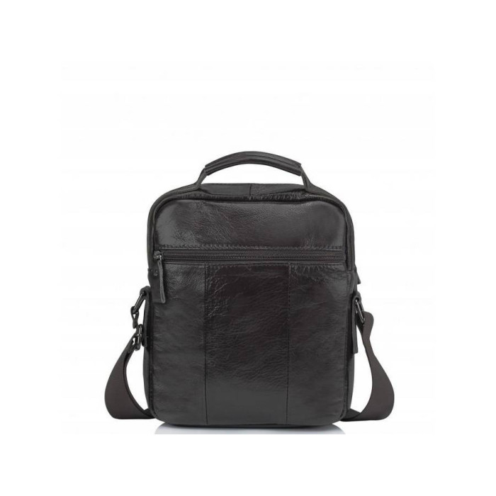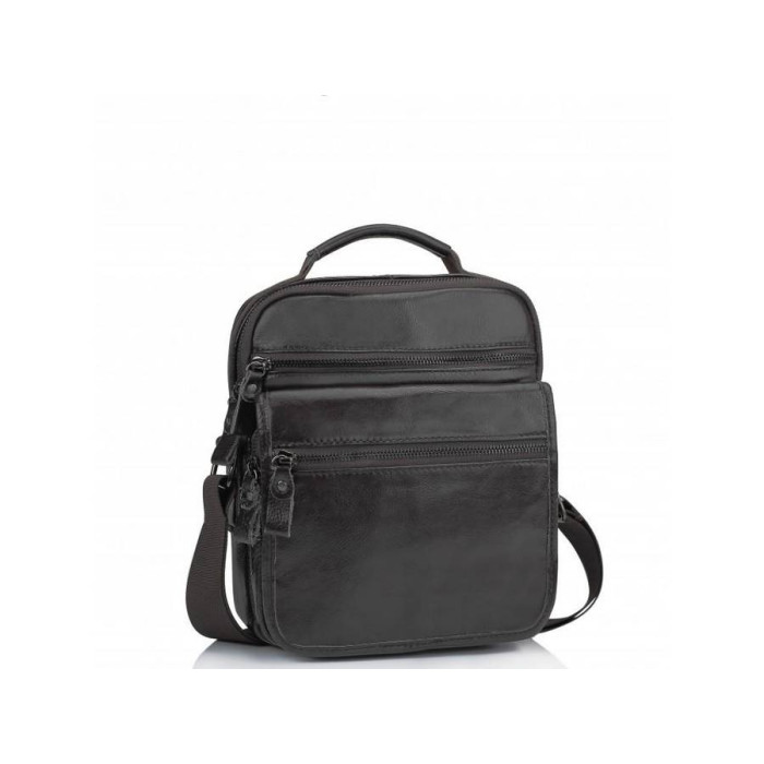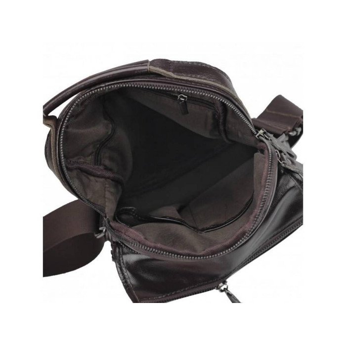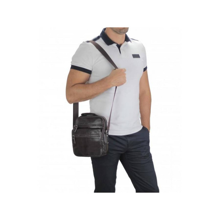 Коричнева чоловіча сумка виконана з натуральної шкіри приємною на дотик. Її можна носити як в руці, так і через плечі. Ремінь на плече легко регулюється по довжині. Сумка складається з одного головного відділення, накладної кишені на блискавці, яка ще й закривається кнопкою на магніті, а також з трьох кишень на блискавці, два знаходяться на лицьовій стороні сумки і один з тильного боку. Всередині є три кишені для дрібниць.