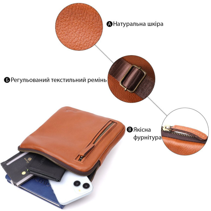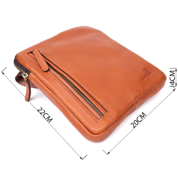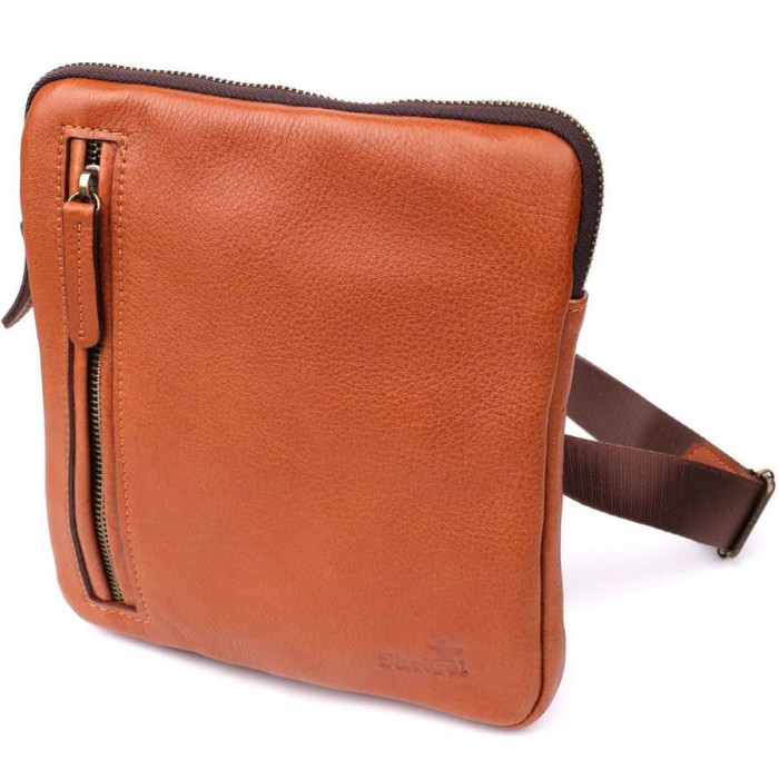 Ця чоловіча вертикальна сумка від українського бренду SHVIGEL виконана із натуральної зернистої шкіри теплого рудого відтінку. Структурована фактура надає виробу солідного і благородного вигляду, а фірмове тиснення логотипу підкреслює справжність і стиль бренду.
