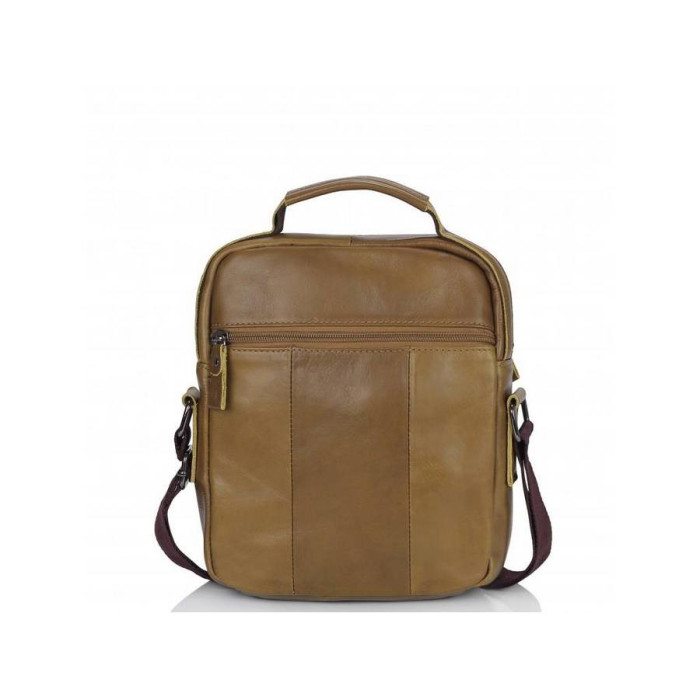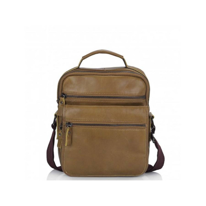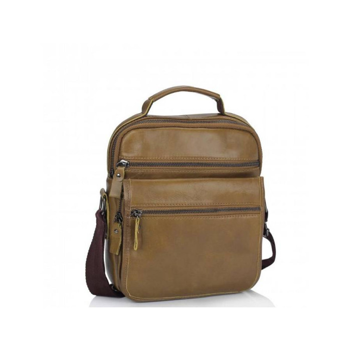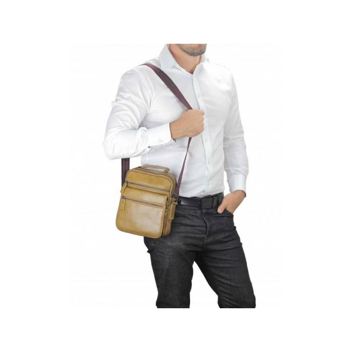 Коричнева шкіряна чоловіча сумка зручної форми. Всередині присутня якісна підкладка. Для носіння на плечі є довга ручка, що регулюється і ручка для носіння в руці. Структура шкіри- гладка. З лицьового боку є дві кишені на блискавці і кишеня з клапаном на магніті, з тильного боку - одна кишеня на блискавці. Усередині сумки - одне велике відділення, одна кишеня на блискавці і дві кишені відкритого типу.