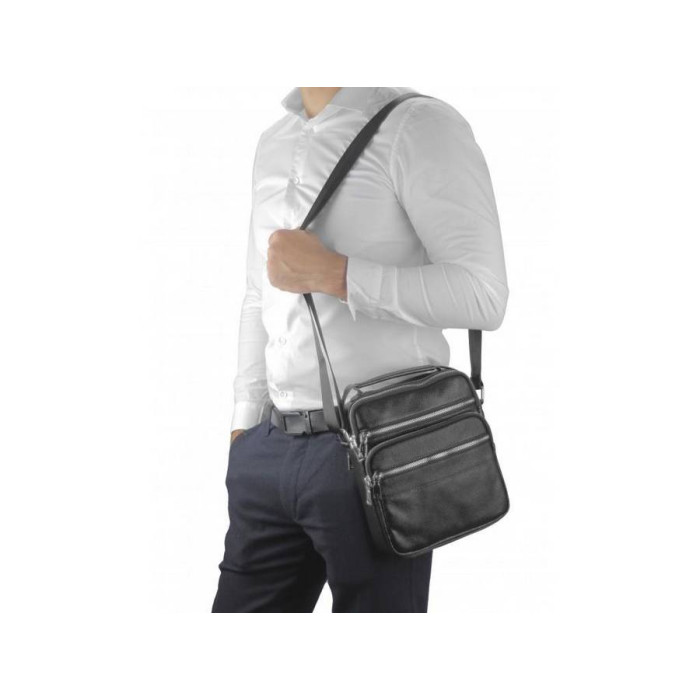 Чоловіча сумка через плече. Зручна в носінні, так як її можна носити як в руці, так і на плечі. Сумка оснащена якісною срібною фурнітурою. Має одне основне відділення, всередині якого є маленька кишеня на блискавцы. З лицьового боку є ще три додаткові кишені на блискавкці. З тильного боку також є кишеня на блискавці.