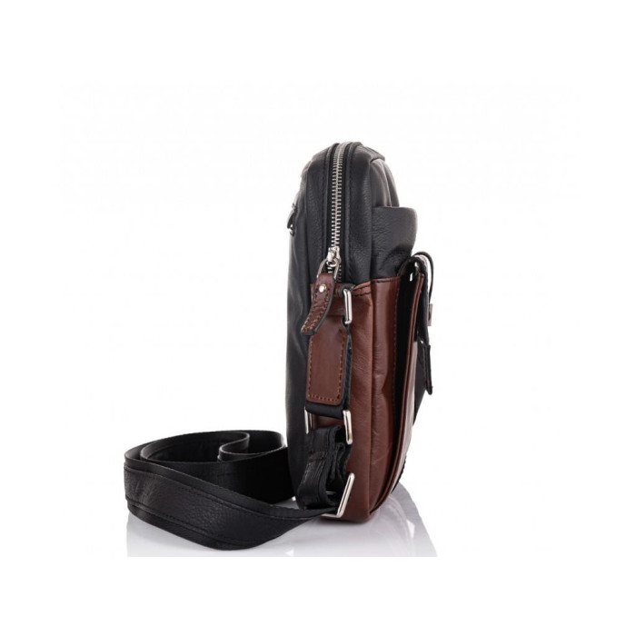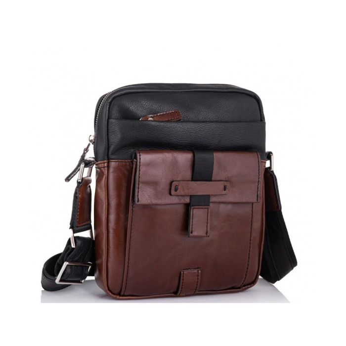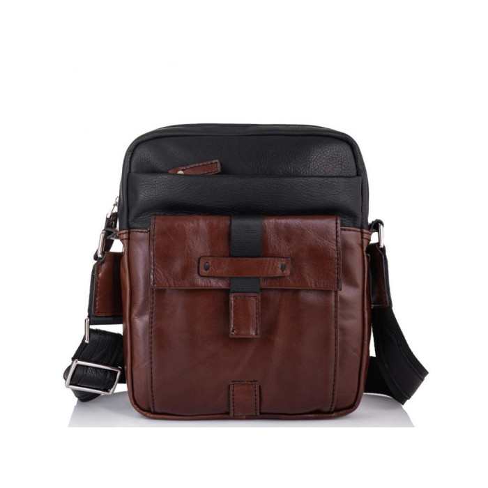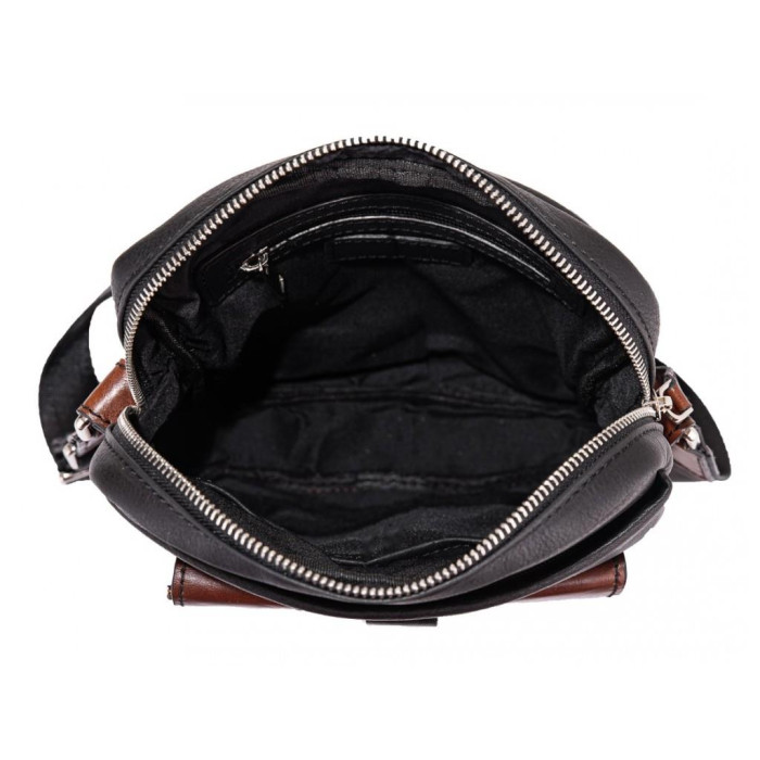 Сумка-месенджер через плече з натуральної шкіри в оригінальному виконанні. Поєднання двох кольорів і текстур шкіри роблять представлену модель універсальною, вона прекрасно доповнить будь-який стиль одягу. Одне основне відділення закривається на металеву блискавку і розміщує в собі кишеню на блискавці і органайзери відкритого типу. З лицьової частини накладна кишеня з клапаном. З тильного боку кишеня на блискавки. Ремінь на плече з щільного текстилю, можливе регулювання по довжині.