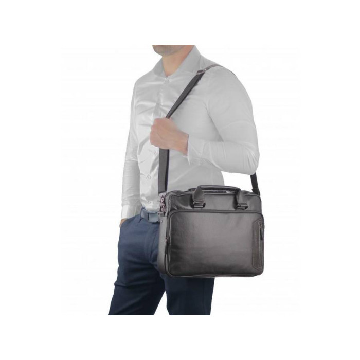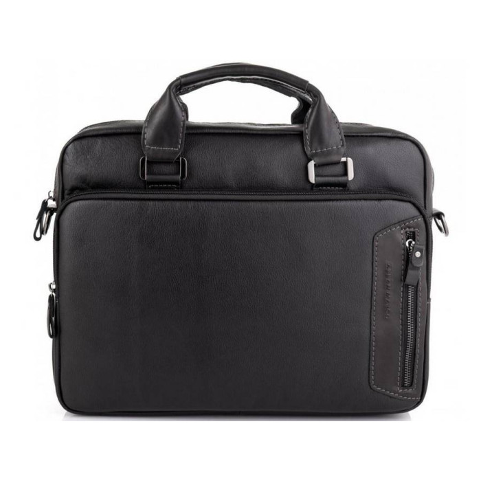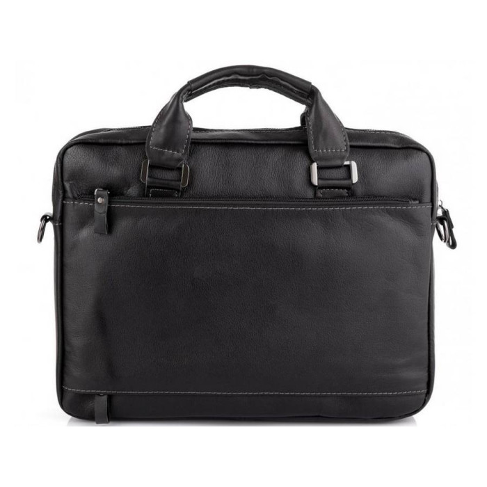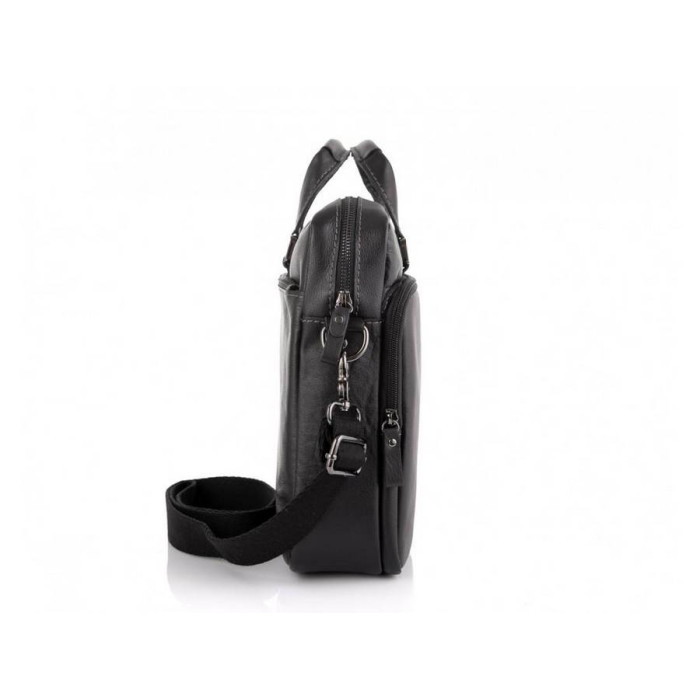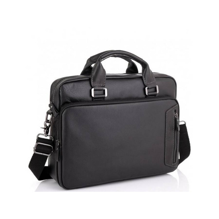 Чорна сумка для ноутбука з двома ручками і текстильним плечовим ременем. Має зернистий тип шкіри. Ремінь кріпиться на надійній сріблястій фурнітурі, його можна регулювати по довжині. Є одне основне відділення на блискавці всередині якого кишеня для гаджета на кнопці, а також кишеня на блискавці і дві кишені відкритого типу. З лицьового боку кишеня на блискавці і маленька кишеня на блискавці вертикального типу. З тильного боку додаткова кишеня на блискавці для дрібниць.