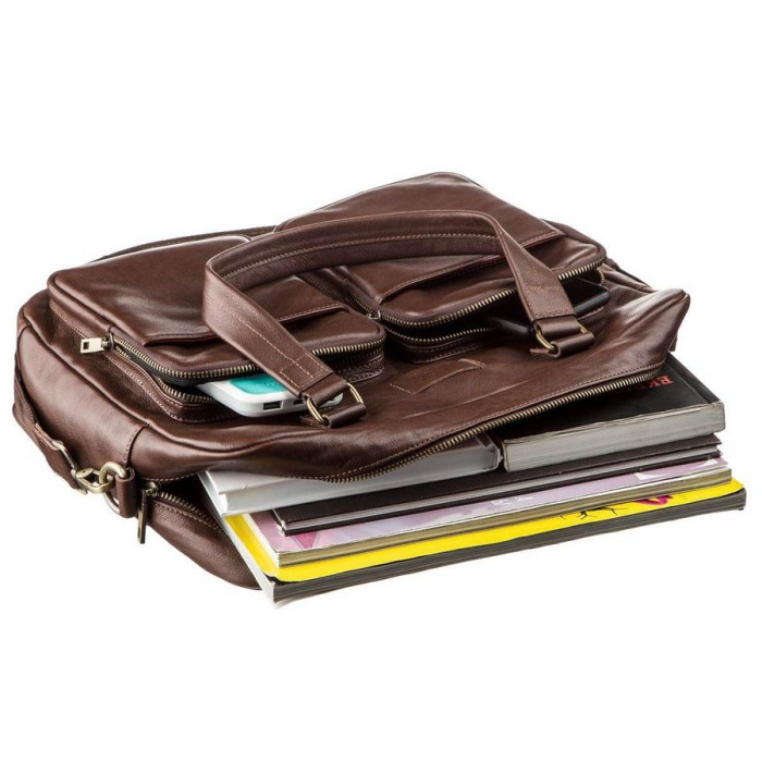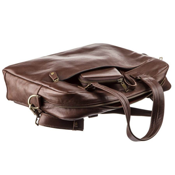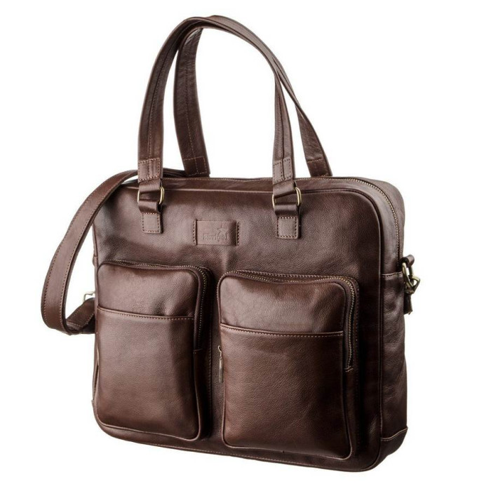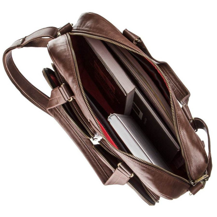 Шкіряна ділова сумка підійде під будь-який стиль. Виріб має класичний дизайн без нічого зайвого. Доповнена модель якісною фурнітурою і оригінальною червоною підкладкою, яка не залишиться непоміченою. Накладні кишені і містке відділення зручно розмістять всі ваші необхідні речі. Дуже містка модель здатна замінити 2 маленькі сумки у відрядження. Шкіряні ручки здатні витримати навантаження. На лицьовій стороні аксесуара тиснений логотип бренду з коричневим рядком.