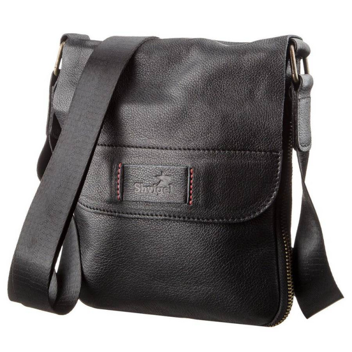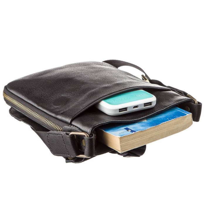Чоловіча шкіряна чорна сумка компактного розміру. Особливістю такої сумки є те, що ви самі можете регулювати її наповненість за допомогою бічних блискавок. Виріб виконаний зі шкіри флотар, на якій менш помітні подряпини і потертості. Сумка практично не вибаглива в догляді. Модель доповнена міцною металевою фурнітурою. Сумка має незнімний текстильний ремінець і тиснений логотип бренду з червоною стрічкою на лицьовій стороні.