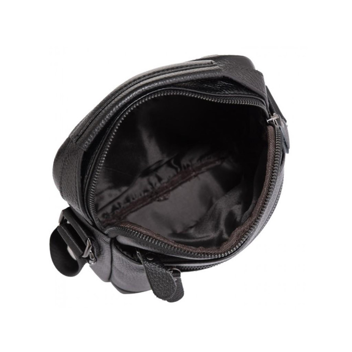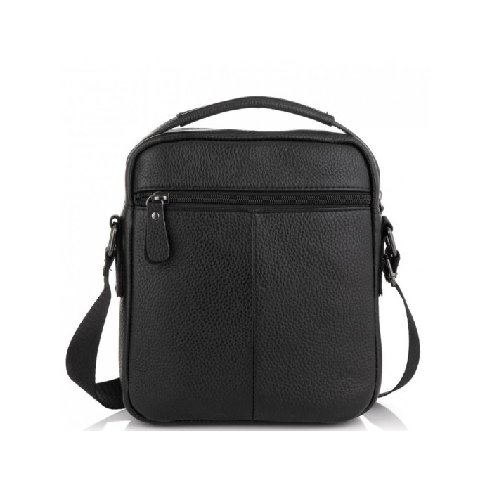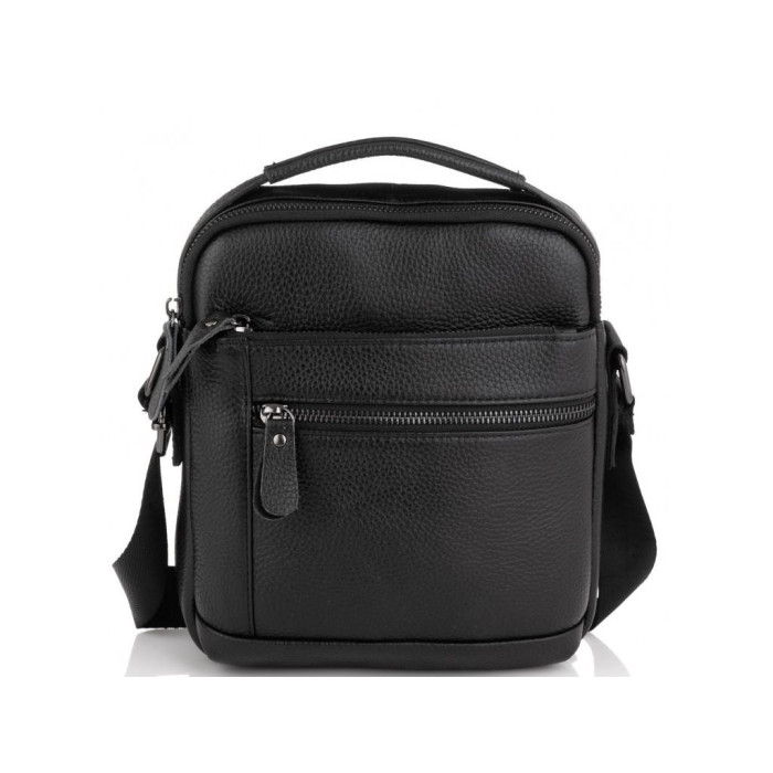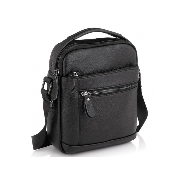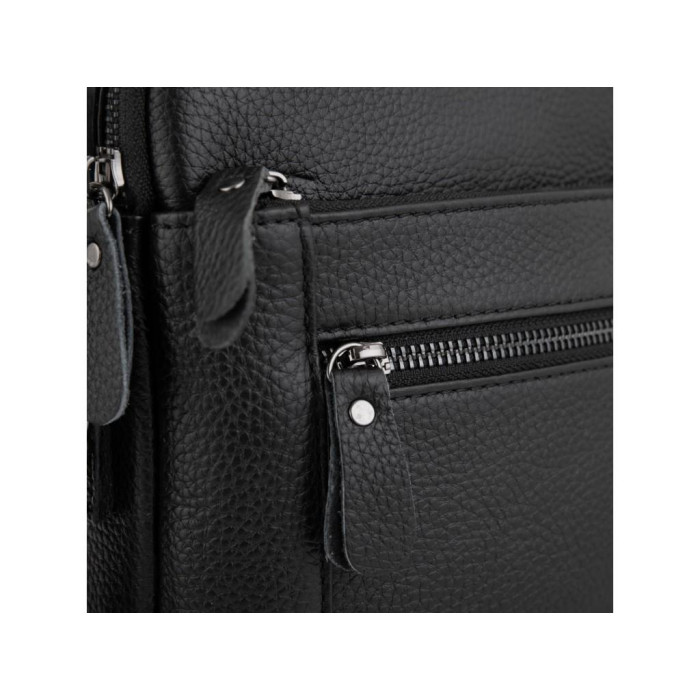Шкіряний месенджер через плече. Зроблений з натуральної шкіри і має зернисту текстуру. Для носки є шкіряна ручка і текстильний ремінь через плече. Пуллера в чоловічій сумці - шкіряні. Одне основне відділення містить у собі кишеню на блискавці для дрібниць. З лицьового боку дві додаткові кишені на блискавці, з тильного боку також є кишеня горизонтального типу.