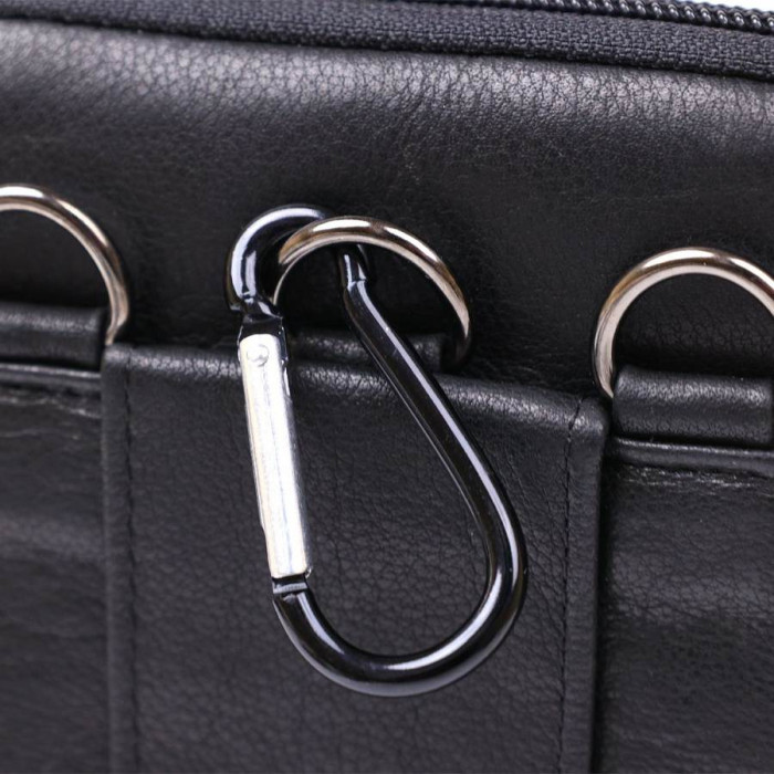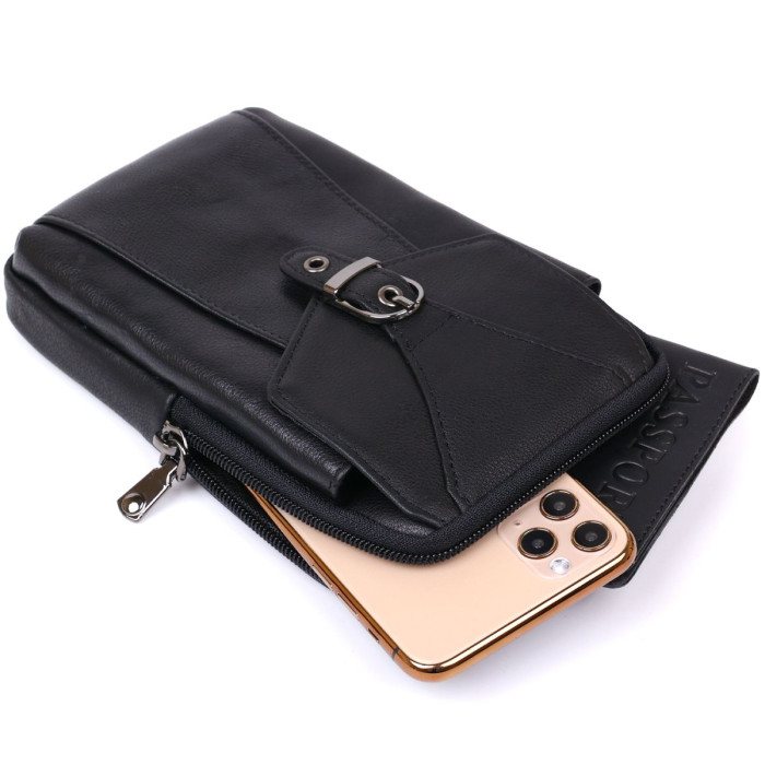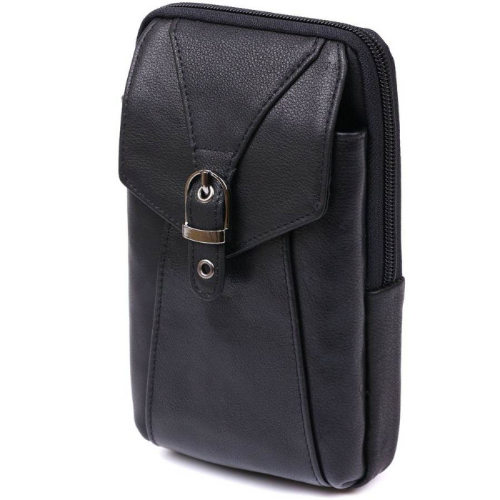 Компактна чоловіча сумка на пояс із натуральної шкіри високої якості та виконання. Має підвищені характеристики міцності та стійкості до зносу. Наповнення представлене у вигляді одного відділення та однієї накладної кишені під клапаном. Цю модель можна носити як на поясі, так і на плечі. Колір виробу універсальний чорний, фактура гладка.