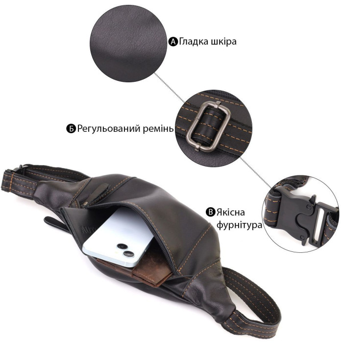 Ця модель стане стильним акцентом в образі сучасного чоловіка, підкреслюючи його смак та увагу до якісних деталей. Сумка-бананка у чорному кольорі – це універсальне рішення для міста, поїздок та активного ритму життя. Прекрасний вибір як для особистого користування, так і як презент для близької людини.