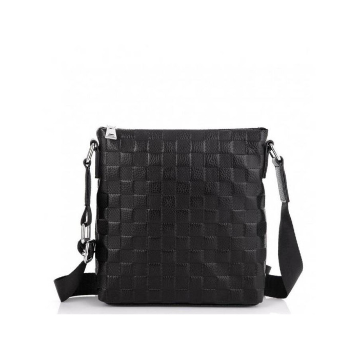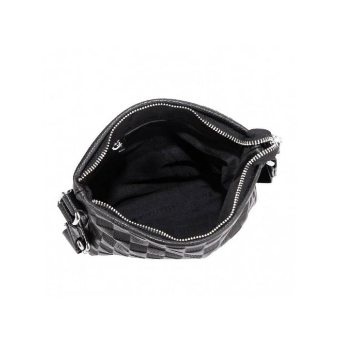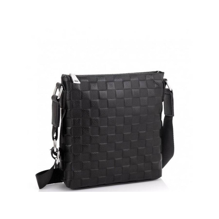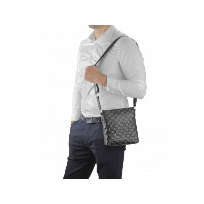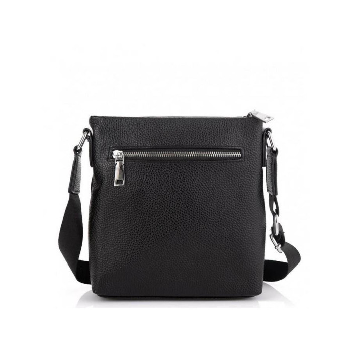 Чоловічий месенджер чорного кольору з фактурною лицьовою стороною. Чоловіча сумка через плече має невеликі розміри, текстильний плечовий ремінь і срібну фурнітуру. В сумки є одне основне відділення на блискавці, всередині якого є кишеня на блискавці і дві кишені відкритого типу. На тильній стороні є кишеня горизонтального типу на блискавці.