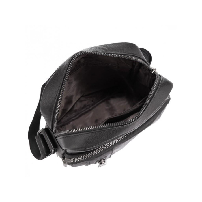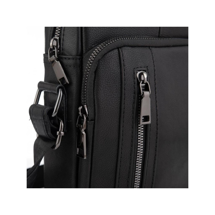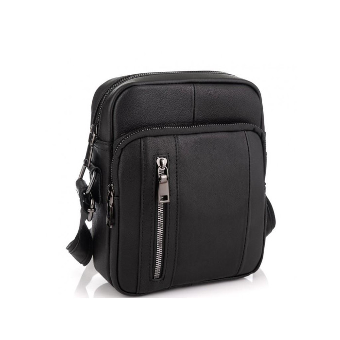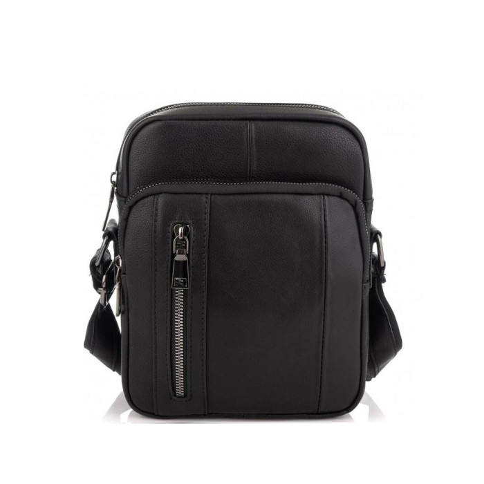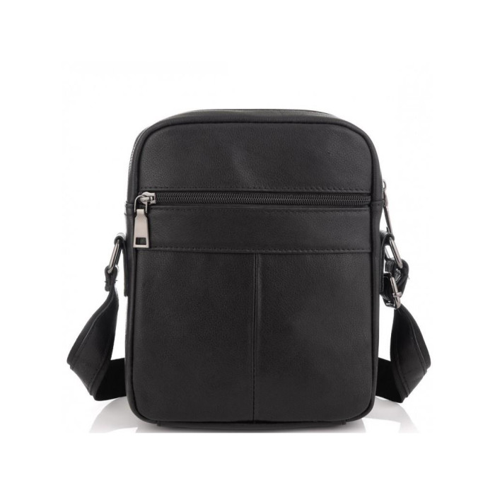 Шкіряна чоловіча чорна сумка, має стильний зовнішній вигляд. Чоловіча сумка оснащена регульованим плечовим ременем і надійною фурнітурою. Чоловіча сумка має одне основне відділення. З лицьового боку дві кишені на блискавці, одна з них горизонтального типу, з тильного боку одина кишеня на блискавці. Усередині маленька кишеня на блискавці і кишеня відкритого типу.