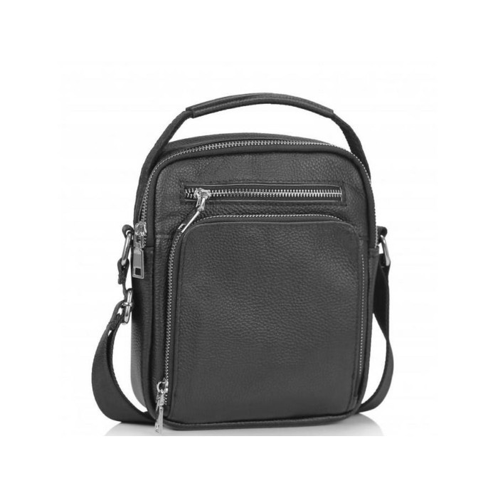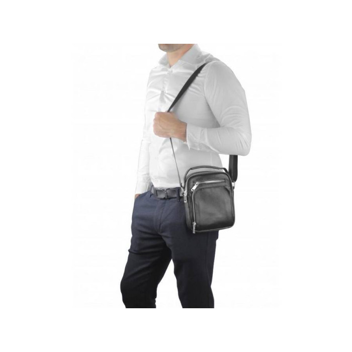 Чоловіча сумка з ручною для носіння в руці і надійним текстильним ременем. Одне основне відділення на блискавці. З лицьового боку накладна кишеня на блискавці, а також невелика кишеня на блискавці горизонтального типу. З тильного боку також є кишеня на блискавці. Усередині сумки маленька кишеня на блискавці і кишеня відкритого типу.