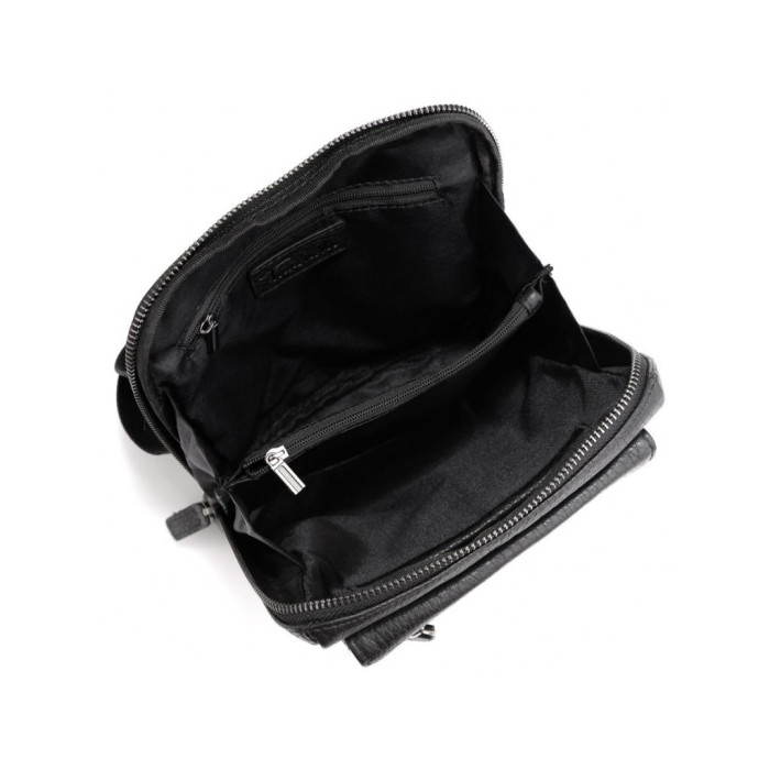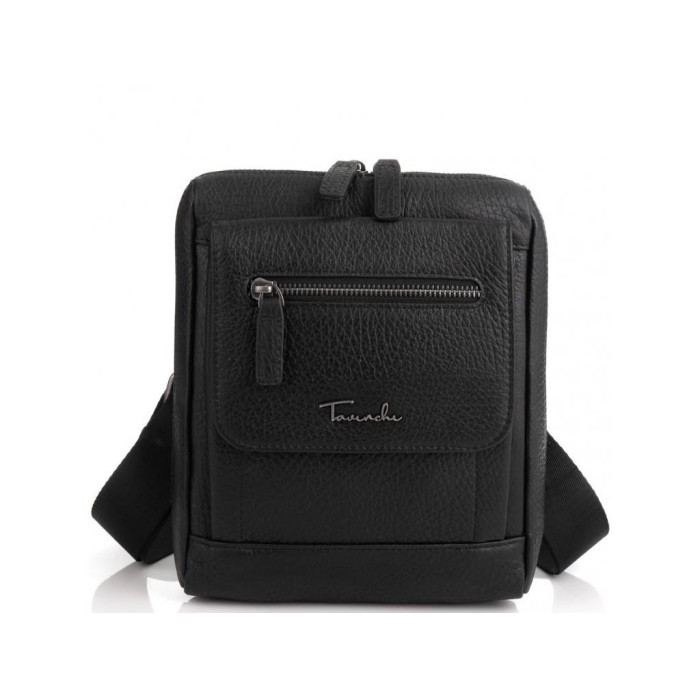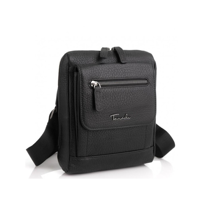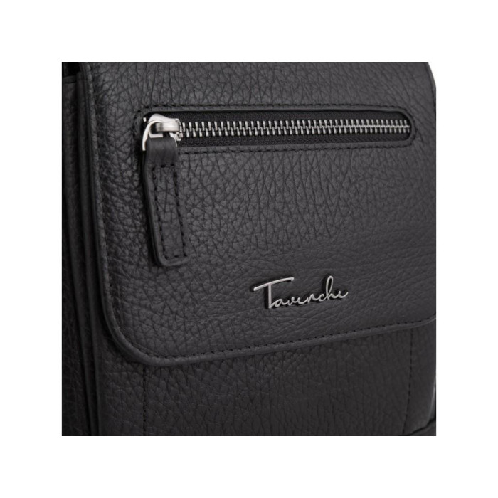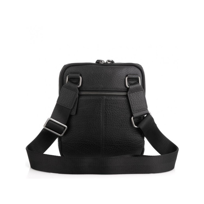 Шкіряна сумка через плече з якісної натуральної шкіри. Сумка має чорний колір. Плечовий ремінь регулюється по довжині, фурнітура темно-срібна, пуллер - металеві. Чоловіча сумка оснащена одним основним відділенням, всередині якого є кишеня перегородка на блискавці, а також кишеня відкритого типу і маленька кишеня на блискавці для дрібниць. З лицьового боку накладна кишеня з клапаном на прихованої магнітній кнопці, на ньому розташована маленька кишеня на блискавці. З тильного боку кишеня на блискавці горизонтального типу.