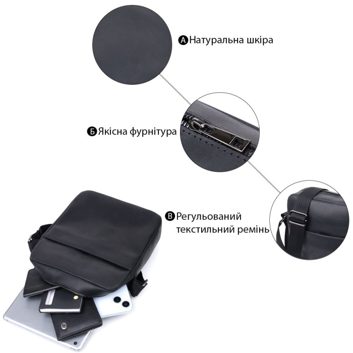 Цікава чоловіча сумка месенджер із люксової шкіри Crazy Horse, яка виглядає зістареною – вічний антикварний та вінтажний вигляд. Вона має гладку матову поверхню, не блищить, згодом через знос така шкіра дряпатиметься і тертиметься, показуючи зміну колірного тону, що дійсно відображає вінтаж. Фурнітура металевого кольору - стійка не змінює свій колір у процесі носіння. Аксесуар чудово поєднується з усіма стилями в одязі та може стати чудовим подарунком на будь-яке свято.