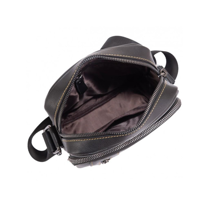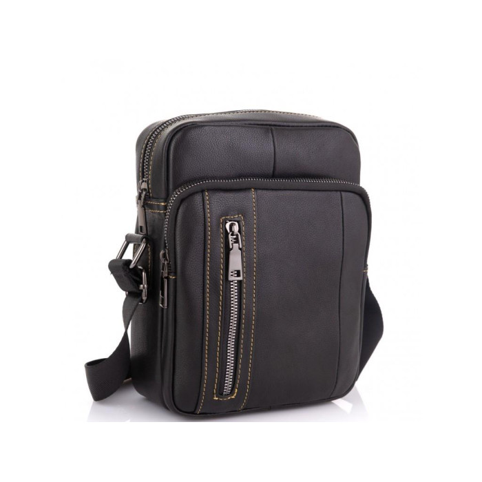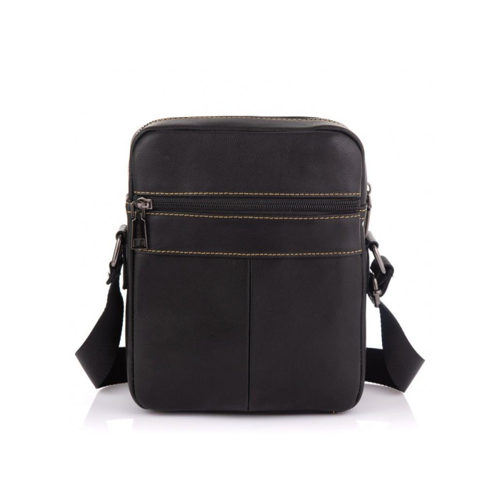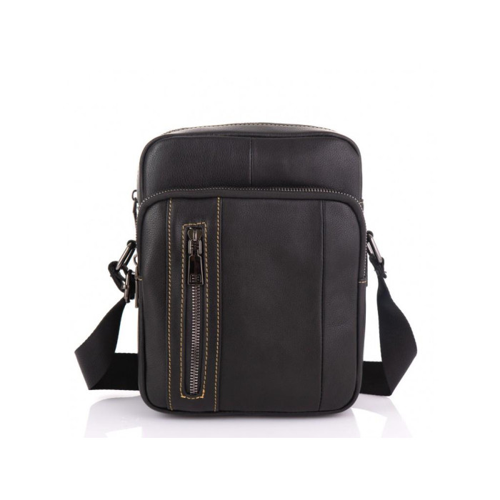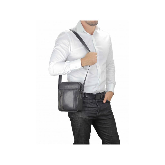 Шкіряна чоловіча чорна сумка, має стильний зовнішній вигляд. Чоловіча сумка оснащена регульованим плечовим ременем і надійною фурнітурою. Чоловіча сумка має одне основне відділення. З лицьового боку дві кишені на блискавці, одна з них горизонтального типу, з тильного боку одина кишеня на блискавці. Усередині маленька кишеня на блискавці і кишеня відкритого типу.