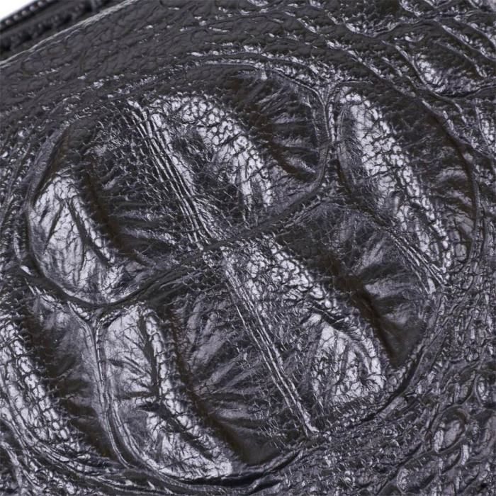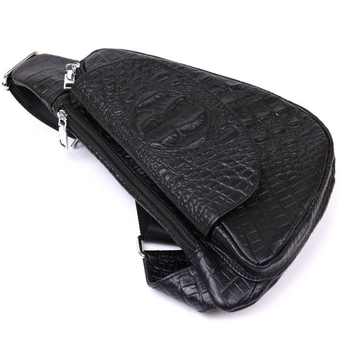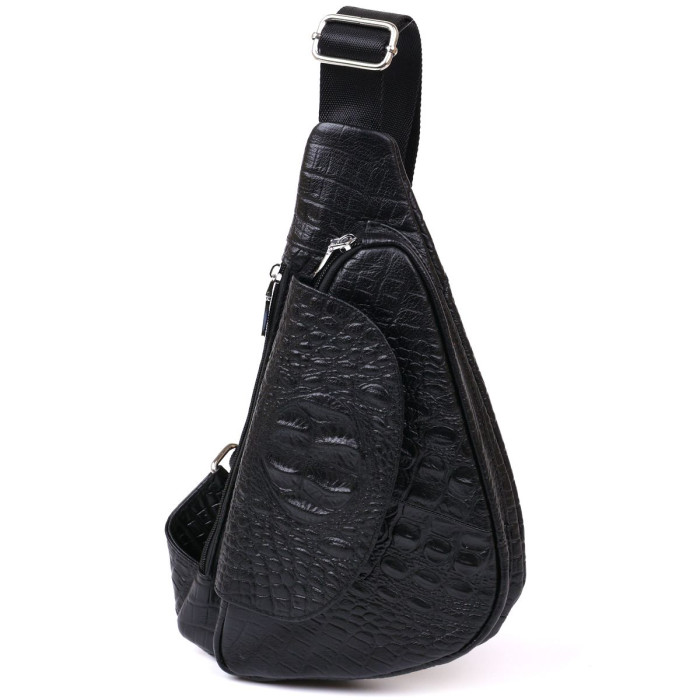 Невелика сумка через плече із натуральної високоякісної шкіри з тисненням під рептилію. Має два місткі відділення на блискавці та додаткову кишеню на тильній стороні. Ремінь виконаний з міцного текстилю і може регулюватися по довжині. Колір даної моделі – універсальний чорний, а значить підійде під будь-який колір одягу.