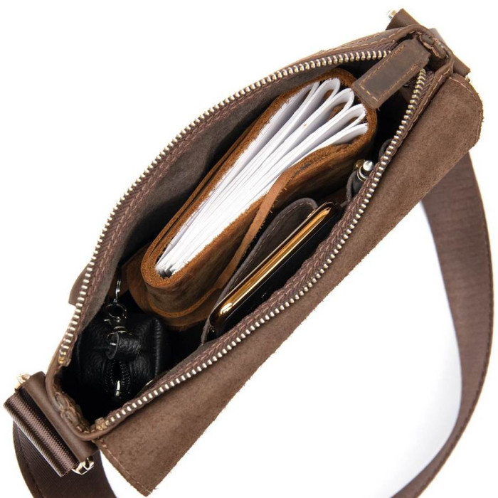 Чоловічий месенджер високого класу виконання і матеріалів. Виготовлений з натуральної шкіри високої міцності. Фактура вінтажна з ефектом старовини, всі подряпини, які будуть згодом з'являтися, додадуть сумці ще більшого шарму. Наповнення месенджера представлено містким відділенням і кишенями на блискавках. Дана сумка стане відмінним подарунком.