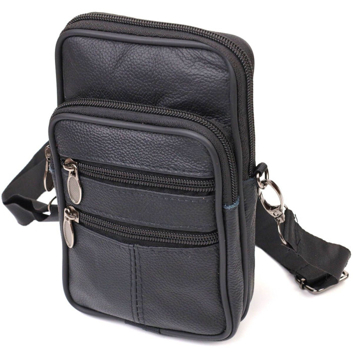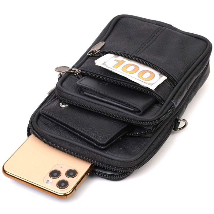 Маленька вертикальна сумка на пояс із натуральної м'якої шкіри. Аксесуар Ви зможете носити на поясі за петельку або на плечі за допомогою знімного текстильного ремінця. Виріб складається з основного відділення та трьох кишень різної величини. Аксесуар стане просто знахідкою у подорожах чи для водіїв.