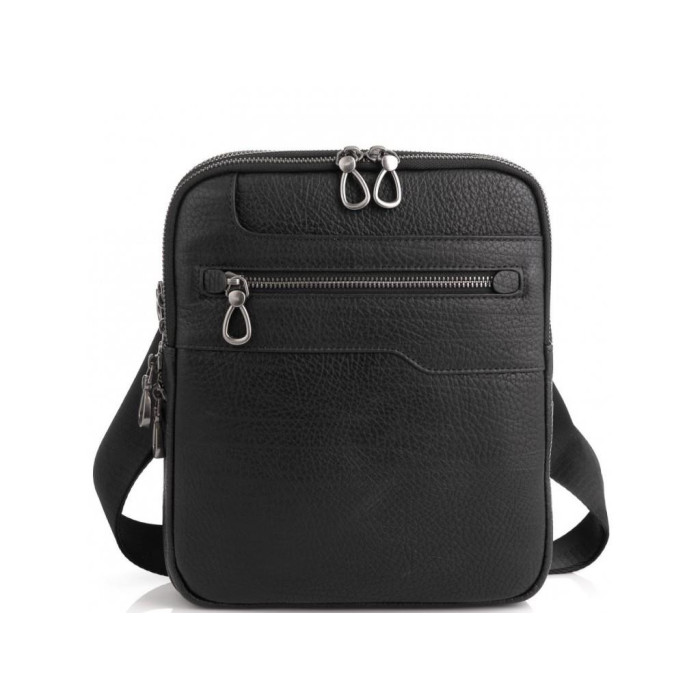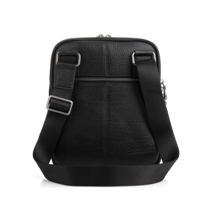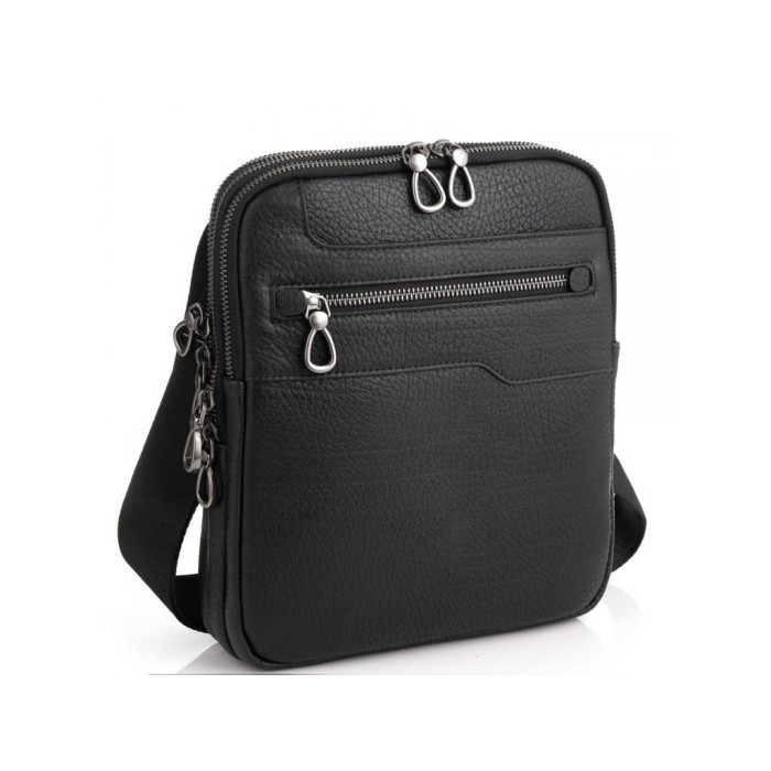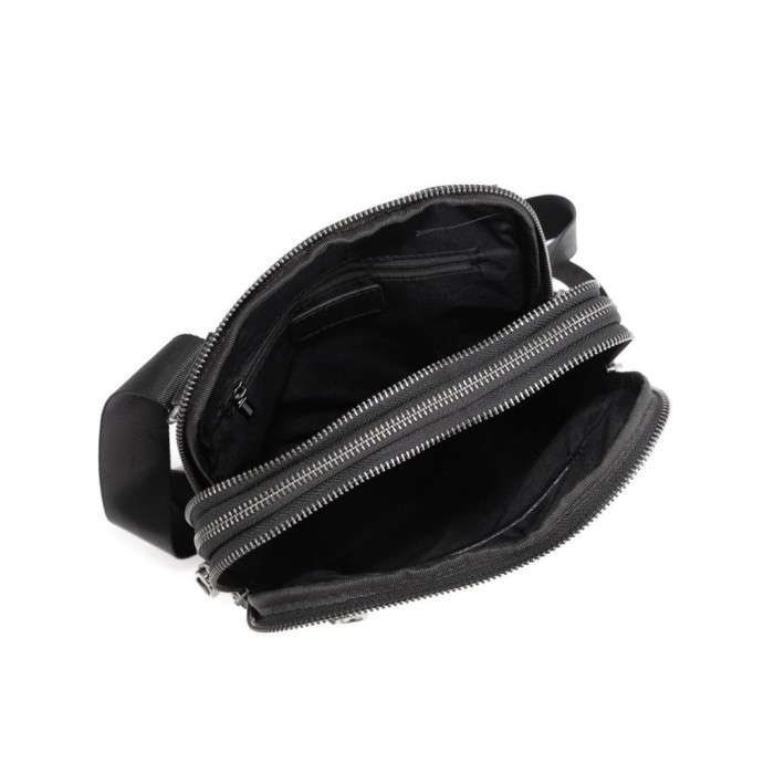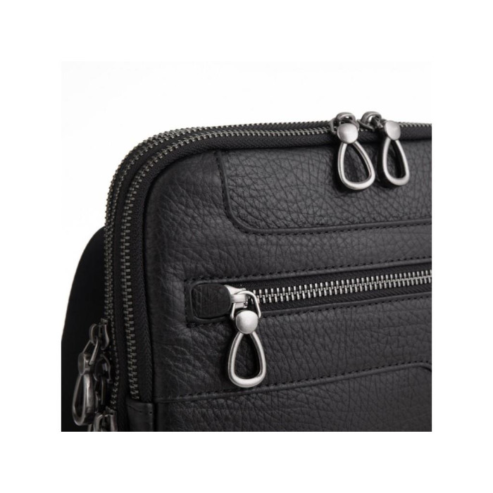 Шкіряна сумка на три відділення. Сумка має чорний колір і зернисту текстуру, зроблена з натуральної шкіри. Пуллера - металеві, ремінь - текстильний, регулюється по довжині. Три основні відділення закриваються на блискавку, всередині відділень є маленькі кишені для дрібниць. З лицьового боку кишеня відкритого типу на кнопці, а також кишеня на блискавці горизонтального типу. З тильного боку також є кишеня на блискавці.
