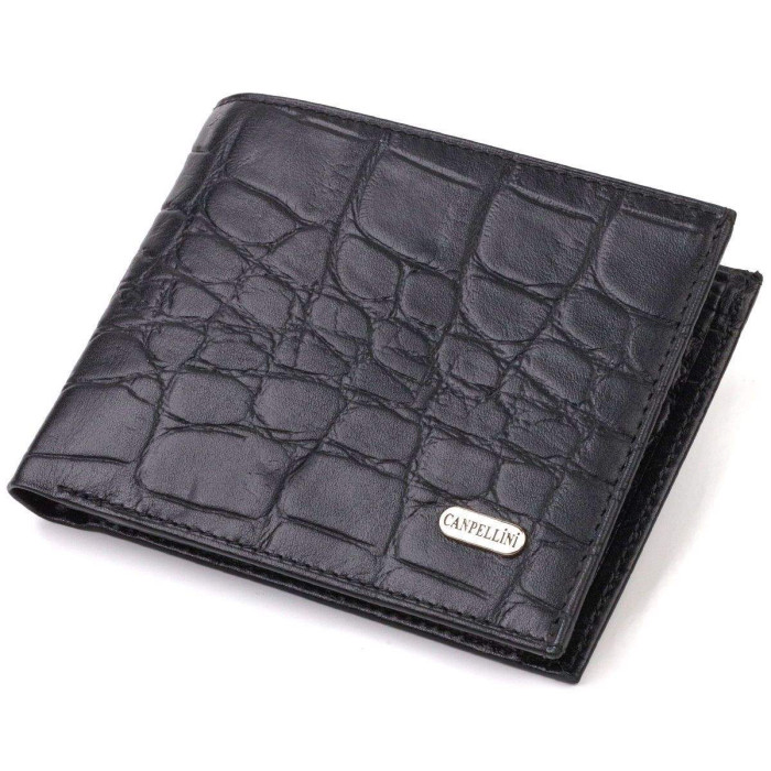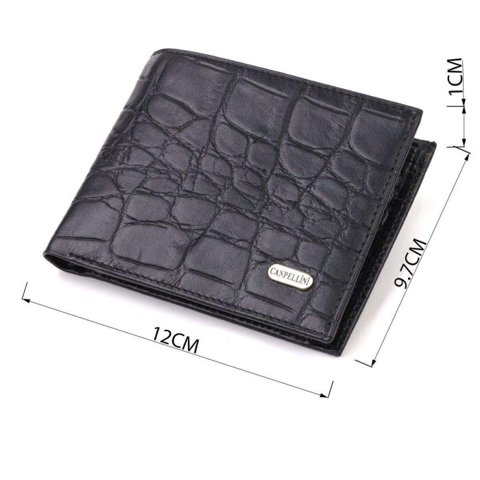 Практичний чоловічий гаманець у чорному кольорі з натуральної шкіри з тисненням під крокодила. Аксесуар має одне основне відділення з перегородкою, в яке поміщаються купюри всіх номіналів, чотири кишені для карток, дві кишені під сіточкою для документів, монетницю та три прилеглі кишені. Закривається аксесуар навпіл без застібки. Запакований гаманець картонну коробку. Шкіряний гаманець є чудовим подарунком для рідних та близьких людей.