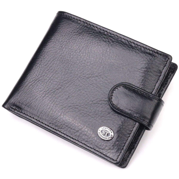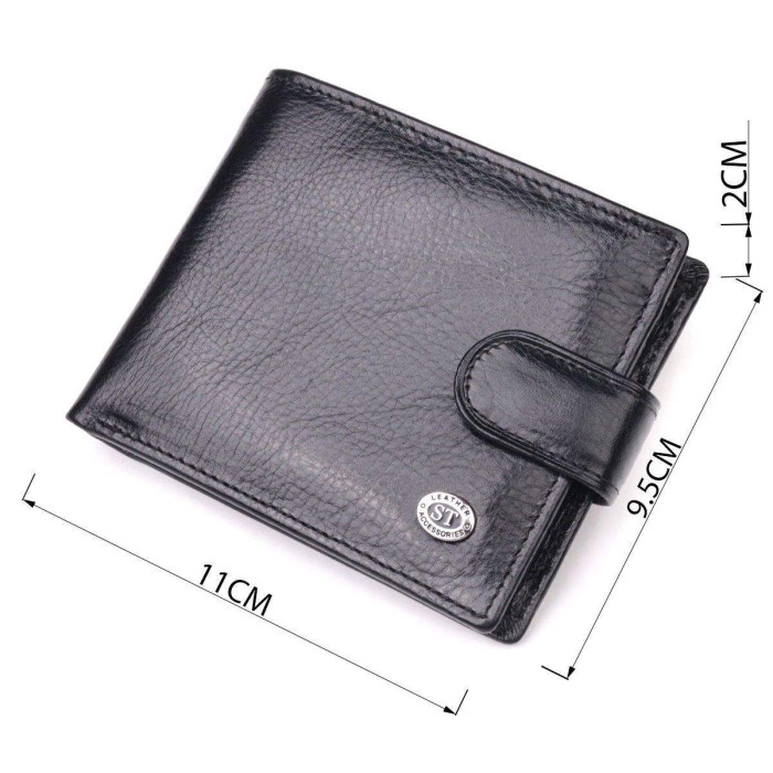 Стандартний чоловічий гаманець у два складання з натуральної гладкої шкіри. Для перегородки між відділеннями використовується натуральна шкіра та міцний текстиль. Виріб складається з трьох великих відділень для купюр, двох прилеглих кишень, трьох осередків для карток та монетниці на кнопці. Продається гаманець у гарній коробці від виробника. Закривається гаманець хлястиком на кнопку.