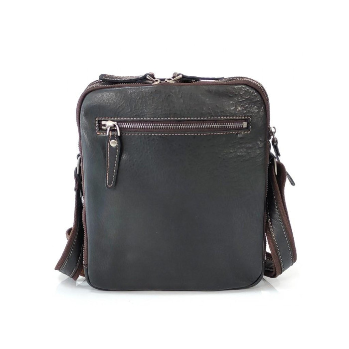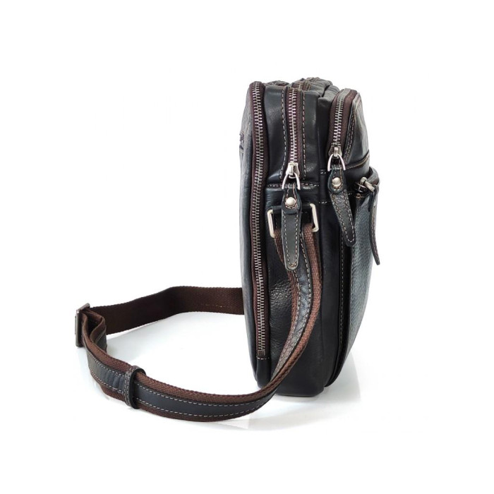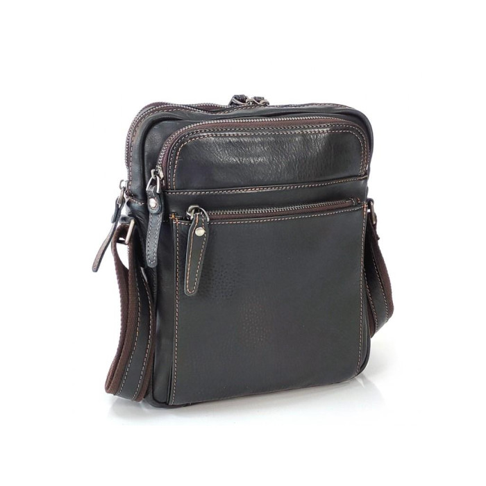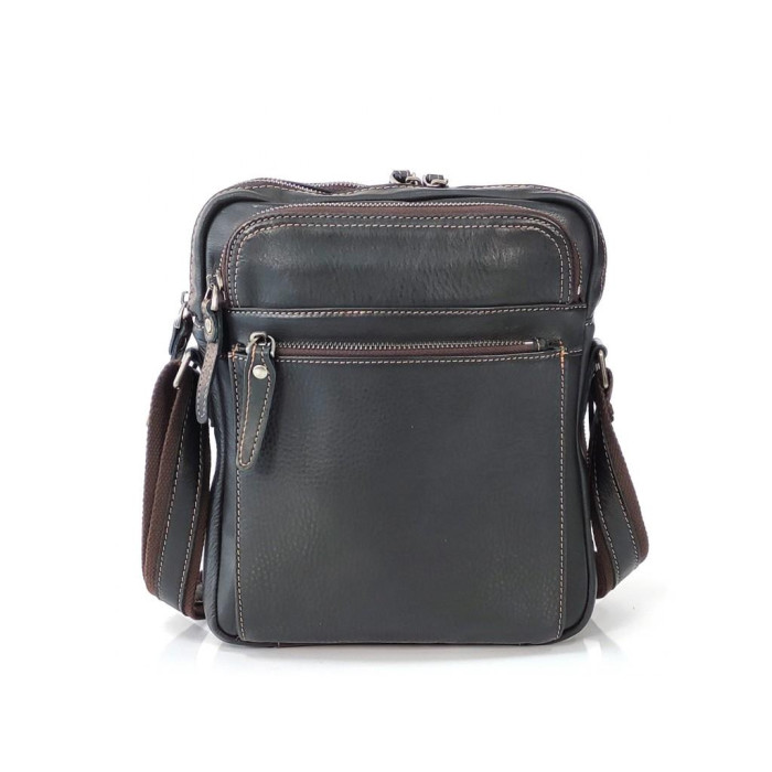 Чоловічий месенджер Tiding Bag Bag Jmd4-V-50043a виготовлений з натуральної шкіри чорного кольору кольору, плечовий ремінь має коричневу окантовку.